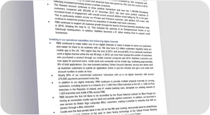 Highlights Building the number one bank for customer service, trust and advocacy in the UK Supporting households and business customers ● RBS continued to deliver strong support for both household and business customers. Within UK PBB, gross new mortgage lending of £29.8 billion was 29% higher than 2015. Across 2016, our market share of new mortgages was 12%, supporting a growth in stock share to 8.8% at end 2016 from 8.2% at end 2015. As a result, total UK PBB net loans and advances increased by 10% compared with 2015. Commercial Banking net loans and advances have also grown by 10% over the course of 2016 reflecting increased borrowing across a number of sectors. ● The Reward account continued to show positive momentum and now has 1,149,000 fee-paying customers compared with 202,000 at 31 December 2015. We have seen positive evidence of increased levels of engagement, with overall current account attrition levels falling by 7% in the year. This is particularly evident across our Private and Premium customer, with attrition 12% lower. We continue to embed the product across our population of valuable main bank customers. ● RBS continues to support UK business growth through the launch of 6 new business accelerator hubs in 2016, bringing the total to 12. This included the opening of an Entrepreneurial Centre in our Edinburgh headquarters. In addition, NatWest launched a £1 billion lending fund to support small businesses. Investing in our operational capabilities and enhancing digital channels ● RBS continued to make better use of our digital channels to make it simpler to serve our customers and easier for them to do business with us. We now have 4.2 million customers regularly using our mobile app in the UK, 19% higher than the end of 2015, and around 60% of our personal customers used a digital channel within the last 90 days. In 2016, we more than doubled the number of customers who purchased a product through our mobile channel compared with 2015. NatWest customers can now apply for personal loans, credit cards and overdrafts via the mobile app, facilitating approximately 8% of total applications. Our new business banking ‘Online Account Opening’ service now allows start up business customers to submit an application online in just ten minutes and get a sort code and account number in under an hour. ● Nearly 80% of our commercial customers’ interaction with us is via digital channels, with around 270,000 payments processed every day. ● In addition to our digital channels, RBS continues to provide multiple physical channels for serving customers, including access to a network of c.11,500 Post Office branches in the UK, c.1,000 An Post branches in the Republic of Ireland, and 41 mobile banking vans, alongside our existing network of 1,425 branches and 4,646 ATMs across PBB. ● RBS became the first UK Bank to be accredited by the Royal National Institute for Blind People for having an accessible mobile app for blind and partially sighted customers. In addition, we launched a new service for British Sign Language (BSL) customers, making it possible to instantly chat with an advisor through a BSL interpreter. ● Coutts won the best private bank in the UK for the fifth year running, best private bank for philanthropy services and best initiative of the year in client facing technology at the Global Private Banking Awards, and was highly commended for innovation for its ‘Coutts Concierge Online’. 9 RBS – Annual results 2016