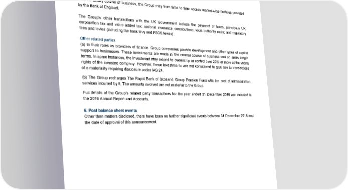 Notes 5. Related party transactions UK Government The UK Government and bodies controlled or jointly controlled by the UK Government and bodies over which it has significant influence are related parties of the Group. The Group enters into transactions with many of these bodies on an arm’s length basis. Bank of England facilities In the ordinary course of business, the Group may from time to time access market-wide facilities provided by the Bank of England. The Group’s other transactions with the UK Government include the payment of taxes, principally UK corporation tax and value added tax; national insurance contributions; local authority rates; and regulatory fees and levies (including the bank levy and FSCS levies). Other related parties (a) In their roles as providers of finance, Group companies provide development and other types of capital support to businesses. These investments are made in the normal course of business and on arm's length terms. In some instances, the investment may extend to ownership or control over 20% or more of the voting rights of the investee company. However, these investments are not considered to give rise to transactions of a materiality requiring disclosure under IAS 24. (b) The Group recharges The Royal Bank of Scotland Group Pension Fund with the cost of administration services incurred by it. The amounts involved are not material to the Group. Full details of the Group’s related party transactions for the year ended 31 December 2016 are included in the 2016 Annual Report and Accounts. 6. Post balance sheet events Other than matters disclosed, there have been no further significant events between 31 December 2016 and the date of approval of this announcement. 62 RBS – Annual results 2016