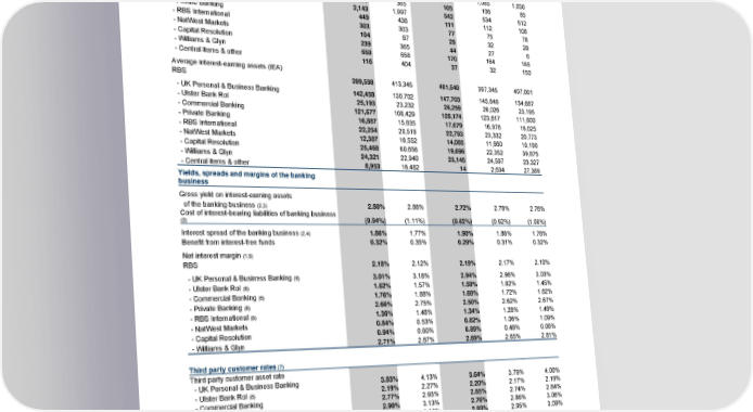 Analysis of results Year ended Quarter ended 31 December 31 December 31 December 30 September 31 December 2016 2015 2016 2016 2015 Net interest income £m £m £m £m £m Net interest income (1) RBS 8,708 8,767 2,208 2,167 2,162 - UK Personal & Business Banking 4,287 4,152 1,093 1,085 1,030 - Ulster Bank RoI 409 365 105 106 85 - Commercial Banking 2,143 1,997 542 534 512 - Private Banking 449 436 111 112 108 - RBS International 303 303 77 75 78 - NatWest Markets 104 87 29 32 28 - Capital Resolution 239 365 44 27 6 - Williams & Glyn 658 658 170 164 165 - Central items & other 116 404 37 32 150 Average interest-earning assets (IEA) RBS 399,598 413,345 401,548 397,345 407,061 - UK Personal & Business Banking 142,458 130,702 147,703 145,649 134,687 - Ulster Bank RoI 25,193 23,232 26,259 26,026 23,195 - Commercial Banking 121,677 106,429 128,174 123,817 111,600 - Private Banking 16,887 15,835 17,679 16,978 16,025 - RBS International 22,254 20,518 22,793 23,332 20,773 - NatWest Markets 12,387 16,552 14,085 11,960 10,190 - Capital Resolution 25,468 60,656 19,696 22,352 39,875 - Williams & Glyn 24,321 22,940 25,145 24,597 23,327 - Central items & other 8,953 16,482 14 2,634 27,389 Yields, spreads and margins of the banking business Gross yield on interest-earning assets of the banking business (2,3) 2.80% 2.88% 2.72% 2.78% 2.78% Cost of interest-bearing liabilities of banking business (0.94%) (1.11%) (0.82%) (0.92%) (1.00%) (2) Interest spread of the banking business (2,4) 1.86% 1.77% 1.90% 1.86% 1.78% Benefit from interest-free funds 0.32% 0.35% 0.29% 0.31% 0.32% Net interest margin (1,5) RBS 2.18% 2.12% 2.19% 2.17% 2.10% - UK Personal & Business Banking (6) 3.01% 3.18% 2.94% 2.96% 3.03% - Ulster Bank RoI (6) 1.62% 1.57% 1.59% 1.62% 1.45% - Commercial Banking (6) 1.76% 1.88% 1.68% 1.72% 1.82% - Private Banking (6) 2.66% 2.75% 2.50% 2.62% 2.67% - RBS International (6) 1.36% 1.48% 1.34% 1.28% 1.49% - NatWest Markets 0.84% 0.53% 0.82% 1.06% 1.09% - Capital Resolution 0.94% 0.60% 0.89% 0.48% 0.06% - Williams & Glyn 2.71% 2.87% 2.69% 2.65% 2.81% Third party customer rates (7) Third party customer asset rate - UK Personal & Business Banking 3.83% 4.13% 3.64% 3.79% 4.00% - Ulster Bank RoI (8) 2.19% 2.27% 2.20% 2.17% 2.19% - Commercial Banking 2.77% 2.93% 2.65% 2.74% 2.84% - Private Banking 2.90% 3.13% 2.76% 2.86% 3.06% - RBS International 3.04% 3.10% 2.93% 2.95% 3.09% Third party customer funding rate - UK Personal & Business Banking (0.45%) (0.66%) (0.28%) (0.44%) (0.63%) - Ulster Bank RoI (8) (0.50%) (0.88%) (0.42%) (0.46%) (0.74%) - Commercial Banking (0.33%) (0.38%) (0.27%) (0.32%) (0.36%) - Private Banking (0.18%) (0.26%) (0.12%) (0.18%) (0.25%) - RBS International (0.14%) (0.31%) (0.08%) (0.10%) (0.24%) Refer to the following page for footnotes. 21 RBS – Annual results 2016