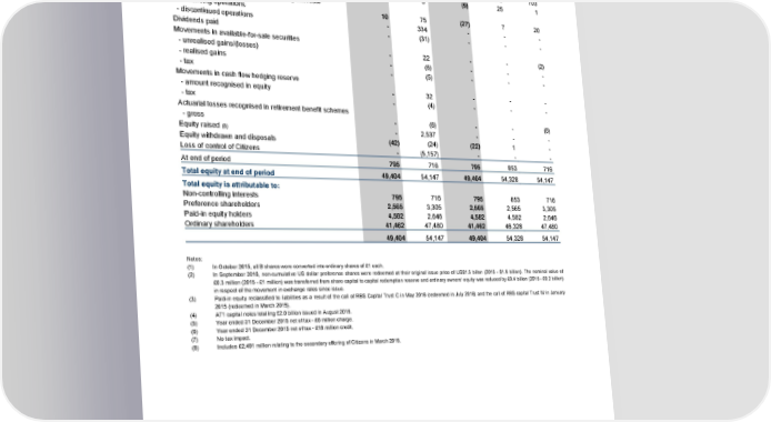Statutory results Condensed consolidated statement of changes in equity for the period ended 31 December 2016 Year ended Quarter ended 31 December 31 December 31 December 30 September 31 December 2016 2015 2016 2016 2015 £m £m £m £m £m Non-controlling interests At beginning of period 716 2,946 853 820 703 Currency translation adjustments and other movements 111 3 (9) 25 1 Profit/(loss) attributable to non-controlling interests - continuing operations 10 75 (27) 7 20 - discontinued operations - 334 - - - Dividends paid - (31) - - - Movements in available-for-sale securities - unrealised gains/(losses) - 22 - - (2) - realised gains - (6) - - - - tax - (5) - - - Movements in cash flow hedging reserve - amount recognised in equity - 32 - - - - tax - (4) - - - Actuarial losses recognised in retirement benefit schemes - gross - (6) - - (6) Equity raised (8) - 2,537 - - - Equity withdrawn and disposals (42) (24) (22) 1 - Loss of control of Citizens - (5,157) - - - At end of period 795 716 795 853 716 Total equity at end of period 49,404 54,147 49,404 54,328 54,147 Total equity is attributable to: Non-controlling interests 795 716 795 853 716 Preference shareholders 2,565 3,305 2,565 2,565 3,305 Paid-in equity holders 4,582 2,646 4,582 4,582 2,646 Ordinary shareholders 41,462 47,480 41,462 46,328 47,480 49,404 54,147 49,404 54,328 54,147 Notes: (1) In October 2015, all B shares were converted into ordinary shares of £1 each. (2) In September 2016, non-cumulative US dollar preference shares were redeemed at their original issue price of US$1.5 billon (2015 - $1.9 billion). The nominal value of £0.3 million (2015 - £1 million) was transferred from share capital to capital redemption reserve and ordinary owners’ equity was reduced by £0.4 billion (2015 - £0.2 billion) in respect of the movement in exchange rates since issue. (3) Paid-in equity reclassified to liabilities as a result of the call of RBS Capital Trust C in May 2016 (redeemed in July 2016) and the call of RBS capital Trust IV in January 2015 (redeemed in March 2015). (4) AT1 capital notes totalling £2.0 billion issued in August 2016. (5) Year ended 31 December 2015 net of tax - £6 million charge. (6) Year ended 31 December 2015 net of tax - £16 million credit. (7) No tax impact. (8) Includes £2,491 million relating to the secondary offering of Citizens in March 2015. 53 RBS – Annual results 2016