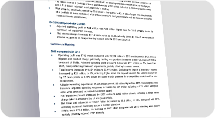Segment performance Q4 2016 compared with Q3 2016 ● Adjusted operating profit of €44 million was €37 million lower than Q3 2016. Adjusted operating expenses increased by €31 million driven by an impairment of intangible assets and a reduction in costs recharged to other business segments. In addition, non-interest income reduced by €12 million principally reflecting an interim adjustment to the pricing of FX transactions between Ulster Bank RoI and NatWest Markets pending completion of a detailed pricing review. ● Litigation and conduct costs increased €93 million primarily reflecting a further provision in respect of remediation and programme costs associated with an industry wide examination of tracker mortgages. ● The recent sale of a portfolio of loans contributed to a €0.5 billion reduction in net loans and advances and a €1.5 billion reduction in risk elements in lending. ● Risk weighted assets decreased by €3.6 billion in the quarter to €21.1 billion largely reflecting the sale of a portfolio of loans combined with enhancements to mortgage models and an improvement in the macro economic environment. Q4 2016 compared with Q4 2015 ● Adjusted operating profit of €44 million was €28 million higher than Q4 2015 primarily driven by increased net impairment releases. ● Net interest margin increased by 14 basis points to 1.59% primarily driven by one-off movements in income recognised on non performing loans in both Q4 2015 and Q4 2016. Commercial Banking 2016 compared with 2015 ● Operating profit was £742 million compared with £1,264 million in 2015 and included a £423 million litigation and conduct charge, principally relating to a provision in respect of the FCA review of RBS’s treatment of SMEs. Adjusted operating profit of £1,273 million was £111 million, or 8%, lower than 2015, mainly reflecting increased impairments, partially offset by increased income. (1) ● Total income increased by £161 million to £3,415 million. Excluding the impact of transfers , income increased by £21 million, or 1%, reflecting higher asset and deposit volumes. Net interest margin fell by 12 basis points to 1.76% driven by asset margin pressure in a competitive market and low rate environment. ● Adjusted operating expenses of £1,936 million were £135 million higher than 2015. Excluding business transfers, adjusted operating expenses increased by £51 million reflecting a £25 million intangible asset write-down and increased investment spend. ● Net impairment losses increased by £137 million to £206 million primarily reflecting a single name charge taken in respect of the oil and gas portfolio. ● Net loans and advances of £100.1 billion increased by £8.8 billion, or 10%, compared with 2015 reflecting increased borrowing across a number of sectors. ● RWAs were £78.5 billion, an increase of £6.2 billion compared with 2015 reflecting asset growth partially offset by reduced RWA intensity. Note: (1) The business transfers included impact of: total income of £218 million (2015 - £79 million; Q4 2016 - £48 million; Q4 2015 - £51 million; Q3 2016 - £58 million); operating expenses of £109 million (2015 - £25 million; Q4 2016 - £29 million; Q4 2015 - £19 million; Q3 2016 - £28 million); impairment losses of £50 million (2015 - £1 million recoveries; Q4 2016 - nil; Q4 2015 - nil; Q3 2016 - £7 million recoveries) net loans and advances to customers of £6.2 billion (31 December 2015 - £5.0 billion; 30 September 2016 - £6.7 billion); customer deposits of £0.4 billion (31 December 2015 - nil; 30 September 2016 - £0.6 billion); and RWAs of £9.3 billion (31 December 2015 - £8.4 billion; 30 September 2016 - £7.4 billion). 41 RBS – Annual results 2016