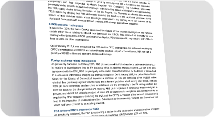 Notes 4. Litigation, investigations and reviews (continued) Tax dispute HMRC issued a tax assessment in 2012 against RBS for approximately £86 million regarding a value-added- tax (“VAT”) matter in relation to the trading of European Union Allowances (“EUAs”) by an RBS joint venture subsidiary in 2009. RBS has commenced legal proceedings before the First-tier Tribunal (Tax), a specialist tax tribunal, challenging the assessment (the “Tax Dispute”). Separately, RBS is a named defendant in proceedings before the High Court brought in 2015 by ten companies (all in liquidation) (the “Liquidated Companies”) and their respective liquidators (together, “the Claimants”). The Liquidated Companies previously traded in EUAs in 2009 and are alleged to be defaulting traders within (or otherwise connected to) the EUA supply chains forming the subject of the Tax Dispute. The Claimants are claiming approximately £72.5 million by alleging that RBS dishonestly assisted the directors of the Liquidated Companies in the breach of their statutory duties and/or knowingly participated in the carrying on of the business of the Liquidated Companies with intent to defraud creditors. RBS strongly denies these allegations. LIBOR and other trading rates In December 2016 the Swiss ComCo announced the closure of four separate investigations into RBS and certain other banks relating to interest rate derivatives and LIBOR. RBS received full immunity for fines relating to the Swiss franc LIBOR benchmark investigation. RBS has agreed to pay a total of CHF17.06m in fines to settle the other investigations. On 3 February 2017, it was announced that RBS and the CFTC entered into a civil settlement resolving the CFTC’s investigation of ISDAFIX and related trading activities. As part of the settlement, RBS has paid a penalty of US$85 million and agreed to certain undertakings. Foreign exchange related investigations As previously disclosed, on 20 May 2015, RBS plc announced that it had reached a settlement with the DOJ in relation to investigations into its FX business within its NatWest Markets segment. As part of its plea agreement with the DOJ, RBS plc pled guilty in the United States District Court for the District of Connecticut to a one-count information charging an antitrust conspiracy. On 5 January 2017, the United States District Court for the District of Connecticut imposed a sentence on RBS plc consisting of the US$395 million criminal fine previously agreed with the DOJ and a term of probation, which among other things, prohibits RBS plc from committing another crime in violation of US law or engaging in the FX trading practices that form the basis for the charged crime and requires RBS plc to implement a compliance program designed to prevent and detect the unlawful conduct at issue and to strengthen its compliance and internal controls as required by other regulators (including the FCA and the CFTC). A violation of the terms of probation could lead to the imposition of additional penalties. Subsequent to the sentencing, RBS plc paid the criminal fine, which had been covered by an existing provision. FCA review of RBS’s treatment of SMEs As previously disclosed, the FCA is conducting a review into the treatment of small and medium enterprise (SME) customers in RBS’s former Global Restructuring Group (GRG) between 2008 and 2013. On 8 November 2016, the FCA published an update on its review. In response, RBS announced steps that will impact SME customers in the UK and the Republic of Ireland that were in GRG between 2008 and 2013. These steps are (i) an automatic refund of certain complex fees; and (ii) a new complaints process, overseen by an Independent Third Party. These steps have been developed with the involvement of the FCA which agreed that they are appropriate for RBS to take. 59 RBS – Annual results 2016