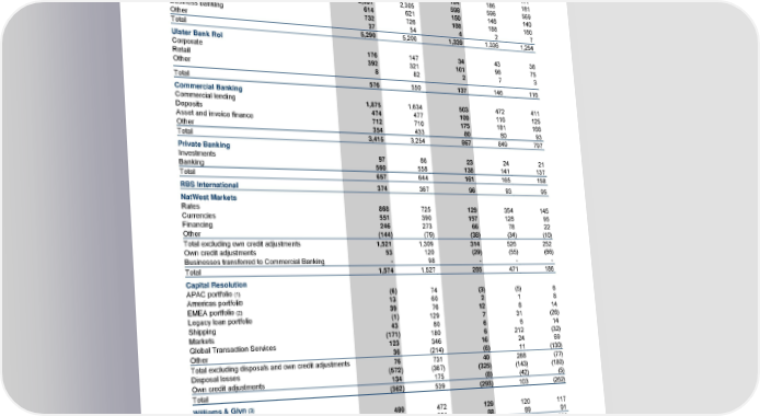 Segment performance Year ended Quarter ended 31 December 31 December 31 December 30 September 31 December 2016 2015 2016 2016 2015 Total income by segment £m £m £m £m £m UK PBB Personal advances 845 747 215 216 177 Personal deposits 731 747 184 186 181 Mortgages 2,331 2,305 598 596 569 Cards 614 621 150 148 140 Business banking 732 726 188 188 180 Other 37 54 4 2 7 Total 5,290 5,200 1,339 1,336 1,254 Ulster Bank RoI Corporate 176 147 34 43 38 Retail 392 321 101 96 75 Other 8 82 2 7 3 Total 576 550 137 146 116 Commercial Banking Commercial lending 1,875 1,634 503 472 411 Deposits 474 477 109 116 125 Asset and invoice finance 712 710 175 181 168 Other 354 433 80 80 93 Total 3,415 3,254 867 849 797 Private Banking Investments 97 86 23 24 21 Banking 560 558 138 141 137 Total 657 644 161 165 158 RBS International 374 367 96 93 95 NatWest Markets Rates 868 725 129 354 145 Currencies 551 390 157 128 95 Financing 246 273 66 78 22 Other (144) (79) (38) (34) (10) Total excluding own credit adjustments 1,521 1,309 314 526 252 Own credit adjustments 53 120 (29) (55) (66) Businesses transferred to Commercial Banking - 98 - - - Total 1,574 1,527 285 471 186 Capital Resolution APAC portfolio (1) (6) 74 (3) (5) 6 Americas portfolio 13 60 2 1 8 EMEA portfolio (2) 39 76 12 8 14 Legacy loan portfolio (1) 129 7 31 (26) Shipping 43 80 6 6 14 Markets (171) 180 6 212 (32) Global Transaction Services 123 346 16 24 69 Other 36 (214) (6) 11 (130) Total excluding disposals and own credit adjustments 76 731 40 288 (77) Disposal losses (572) (367) (325) (143) (180) Own credit adjustments 134 175 (8) (42) (5) Total (362) 539 (293) 103 (262) Williams & Glyn (3) Retail 480 472 129 120 117 Commercial 357 361 88 89 91 Total 837 833 217 209 208 Central items 229 9 407 (62) (68) Total RBS 12,590 12,923 3,216 3,310 2,484 Notes: (1) Asia-Pacific portfolio. (2) European, the Middle East and African portfolio. (3) Williams & Glyn refers to the business formerly intended to be divested as a separate legal entity and comprises RBS England and Wales branch-based businesses, along with certain small and medium enterprises and corporate activities across the UK. During the period presented W&G has not operated as a separate legal entity. 35 RBS – Annual results 2016