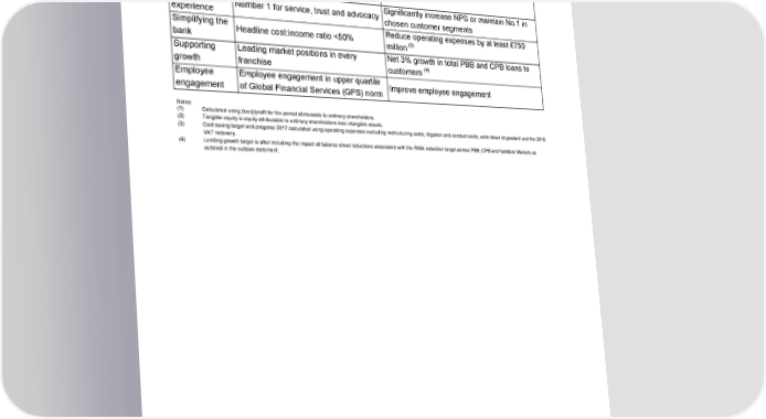 Highlights 2017 targets As we works towards our long-term goals, we have set the following targets for 2017. Strategy goal Our long-term targets Our 2017 goals Strength and CET1 ratio of 13% Maintain bank CET1 ratio of 13% (1,2) ≥ 12% sustainability RoTE Customer Number 1 for service, trust and advocacy Significantly increase NPS or maintain No.1 in experience chosen customer segments Simplifying the Headline cost:income ratio <50% Reduce operating expenses by at least £750 bank million (3) Supporting Leading market positions in every Net 3% growth in total PBB and CPB loans to (4) growth franchise customers Employee Employee engagement in upper quartile Improve employee engagement engagement of Global Financial Services (GFS) norm Notes: (1) Calculated using (loss)/profit for the period attributable to ordinary shareholders. (2) Tangible equity is equity attributable to ordinary shareholders less intangible assets. (3) Cost saving target and progress 2017 calculated using operating expenses excluding restructuring costs, litigation and conduct costs, write down of goodwill and the 2016 VAT recovery. (4) Lending growth target is after including the impact of balance sheet reductions associated with the RWA reduction target across PBB, CPB and NatWest Markets as outlined in the outlook statement. 15 RBS – Annual results 2016