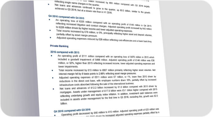 Segment performance Q4 2016 compared with Q3 2016 ● An operating loss of £225 million compared with an operating profit of £355 million in Q3 2016 reflecting increased litigation and conduct charges. Adjusted operating profit of £228 million was £154 million lower than Q3 2016 driven by increased adjusted operating expenses and increased impairments. ● Adjusted operating expenses increased by £109 million principally due to the annual UK bank levy charge, £90 million. ● Net impairment losses of £83 million increased by £63 million compared with Q3 2016 largely reflecting single name charges in the quarter. ● Net loans and advances continued to grow in the quarter, up £0.3 billion, similar to the growth achieved in Q3 2016, but at a slower rate than in H1 2016. Q4 2016 compared with Q4 2015 ● An operating loss of £225 million compared with an operating profit of £140 million in Q4 2015 reflecting increased litigation and conduct charges. Adjusted operating profit increased by £42 million to £228 million driven by higher income and lower adjusted operating expenses. ● Total income increased by £70 million, or 9%, principally reflecting higher asset and deposit volumes, partially offset by asset margin pressure. ● Adjusted operating expenses reduced by £28 million reflecting cost efficiencies and a lower bank levy. Private Banking 2016 compared with 2015 ● An operating profit of £111 million compared with an operating loss of £470 million in 2015 which included a goodwill impairment of £498 million. Adjusted operating profit of £149 million was £36 million, or 32%, higher than 2015 reflecting increased income, lower adjusted operating expenses and lower impairments. ● Total income increased by £13 million to £657 million primarily reflecting higher asset volumes. Net interest margin fell by 9 basis points to 2.66% reflecting asset margin pressures. ● Adjusted operating expenses of £511 million were £7 million, or 1%, lower than 2015 driven by reductions in the direct cost base, with employee numbers down 10%, partially offset by increased infrastructure costs absorbed following the sale of the international business. ● Net loans and advances of £12.2 billion increased by £1.0 billion compared with 2015 driven by mortgages. Assets under management of £17.0 billion were £3.1 billion higher compared with 2015 reflecting underlying growth and equity index inflation. In addition, investment cash balances were included in assets under management for the first time in Q3 2016, excluding this, growth was £2.0 billion. Q4 2016 compared with Q3 2016 ● Operating profit decreased by £40 million to £10 million. Adjusted operating profit of £23 million was £30 million lower than Q3 2016 driven by increased adjusted operating expenses partially offset by a net impairment release in Q4 2016. ● Adjusted operating expenses increased by £37 million due to the annual UK bank levy charge, £19 million, and a £13 million VAT recovery in Q3 2016. ● Net loans and advances increased by £0.4 billion to £12.2 billion due to increased mortgage lending. Assets under management increased by £0.5 billion to £17.0 billion driven by market movements. 42 RBS – Annual results 2016