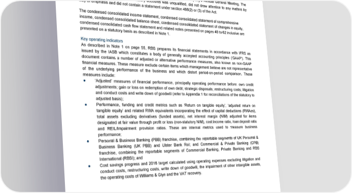 Introduction In this document, ‘RBSG plc’ or the ‘parent company’ refers to The Royal Bank of Scotland Group plc, and ‘RBS’ or the ‘Group’ refers to RBSG plc and its subsidiaries. Financial information contained in this document does not constitute statutory accounts within the meaning of section 434 of the Companies Act 2006 (‘the Act’). The statutory accounts for the year ended 31 December 2015 have been filed with the Registrar of Companies and those for the year ended 31 December 2016 will be filed with the Registrar of Companies following the company’s Annual General Meeting. The report of the auditor on those statutory accounts was unqualified, did not draw attention to any matters by way of emphasis and did not contain a statement under section 498(2) or (3) of the Act. The condensed consolidated income statement, condensed consolidated statement of comprehensive income, condensed consolidated balance sheet, condensed consolidated statement of changes in equity, condensed consolidated cash flow statement and related notes presented on pages 48 to 62 inclusive are presented on a statutory basis as described in Note 1. Key operating indicators As described in Note 1 on page 55, RBS prepares its financial statements in accordance with IFRS as issued by the IASB which constitutes a body of generally accepted accounting principles (‘GAAP’). This document contains a number of adjusted or alternative performance measures, also known as non-GAAP financial measures. These measure exclude certain items which management believe are not representative of the underlying performance of the business and which distort period-on-period comparison. These measures include: ● ‘Adjusted’ measures of financial performance, principally operating performance before: own credit adjustments; gain or loss on redemption of own debt; strategic disposals; restructuring costs; litigation and conduct costs and write down of goodwill (refer to Appendix 1 for reconciliations of the statutory to adjusted basis); ● Performance, funding and credit metrics such as ‘Return on tangible equity’, ‘adjusted return on tangible equity’ and related RWA equivalents incorporating the effect of capital deductions (RWAes), total assets excluding derivatives (funded assets), net interest margin (NIM) adjusted for items designated at fair value through profit or loss (non-statutory NIM), cost:income ratio, loan:deposit ratio and REIL/Impairment provision ratios. These are internal metrics used to measure business performance; ● Personal & Business Banking (PBB) franchise, combining the reportable segments of UK Personal & Business Banking (UK PBB) and Ulster Bank RoI; and Commercial & Private Banking (CPB) franchise, combining the reportable segments of Commercial Banking, Private Banking and RBS International (RBSI); and ● Cost savings progress and 2016 target calculated using operating expenses excluding litigation and conduct costs, restructuring costs, write down of goodwill, the impairment of other intangible assets, the operating costs of Williams & Glyn and the VAT recovery. 2 RBS – Annual results 2016
