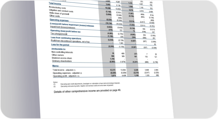 Summary consolidated income statement for the period ended 31 December 2016 Year ended Quarter ended 31 December31 December 31 December 30 September31 December 2016 2015 2016 2016 2015 £m £m £m £m £m Net interest income 8,708 8,767 2,208 2,167 2,162 Own credit adjustments 180 309 (114) (156) (115) (Loss)/gain on redemption of own debt (126) (263) 1 3 (263) Strategic disposals 164 (157) - (31) (22) Other operating income 3,664 4,267 1,121 1,327 722 Non-interest income 3,882 4,156 1,008 1,143 322 Total income 12,590 12,923 3,216 3,310 2,484 Restructuring costs (2,106) (2,931) (1,007) (469) (614) Litigation and conduct costs (5,868) (3,568) (4,128) (425) (2,124) Write down of goodwill - (498) - - (498) Other costs (8,220) (9,356) (2,219) (2,017) (2,525) Operating expenses (16,194) (16,353) (7,354) (2,911) (5,761) (Loss)/profit before impairment (losses)/releases (3,604) (3,430) (4,138) 399 (3,277) Impairment (losses)/releases (478) 727 75 (144) 327 Operating (loss)/profit before tax (4,082) (2,703) (4,063) 255 (2,950) Tax (charge)/credit (1,166) (23) (244) (582) 261 Loss from continuing operations (5,248) (2,726) (4,307) (327) (2,689) Profit from discontinued operations, net of tax - 1,541 - - 90 Loss for the period (5,248) (1,185) (4,307) (327) (2,599) Attributable to: Non-controlling interests 10 409 (27) 7 20 Other owners 504 385 161 135 121 Dividend access share 1,193 - - - - Ordinary shareholders (6,955) (1,979) (4,441) (469) (2,740) Memo: Total income - adjusted (1) 12,372 13,034 3,329 3,494 2,884 Operating expenses - adjusted (2) (8,220) (9,356) (2,219) (2,017) (2,525) Operating profit - adjusted (1,2) 3,674 4,405 1,185 1,333 686 Notes: (1) Excluding own credit adjustments, (loss)/gain on redemption of own debt and strategic disposals. (2) Excluding restructuring costs, litigation and conduct costs and write down of goodwill. Details of other comprehensive income are provided on page 49. 19 RBS – Annual results 2016