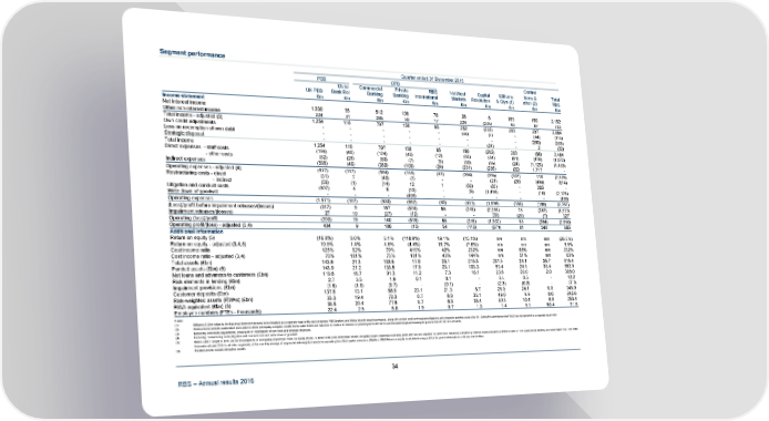Segment performance Quarter ended 31 December 2015 PBB CPB Central Ulster Commercial Private RBS NatWest Capital Williams items & Total UK PBB Bank RoI Banking Banking International Markets Resolution & Glyn (1) other (2) RBS £m £m £m £m £m £m £m £m £m £m Income statement Net interest income 1,030 85 512 108 78 28 6 165 150 2,162 Other non-interest income 224 31 285 50 17 224 (239) 43 87 722 Total income - adjusted (3) 1,254 116 797 158 95 252 (233) 208 237 2,884 Own credit adjustments - - - - - (66) (5) - (44) (115) Loss on redemption of own debt - - - - - - - - (263) (263) Strategic disposal - - - - - - (24) - 2 (22) Total income 1,254 116 797 158 95 186 (262) 208 (68) 2,484 Direct expenses - staff costs (199) (40) (124) (43) (12) (63) (54) (61) (476) (1,072) - other costs (82) (28) (80) (7) (5) (50) (54) (24) (1,123) (1,453) Indirect expenses (596) (49) (380) (109) (24) (251) (286) (22) 1,717 - Operating expenses - adjusted (4) (877) (117) (584) (159) (41) (364) (394) (107) 118 (2,525) Restructuring costs - direct (31) 7 (40) (7) - - (21) (28) (494) (614) - indirect (56) (1) (14) 12 1 (62) (83) - 203 - Litigation and conduct costs (607) 4 8 (10) - (5) (1,498) - (16) (2,124) Write down of goodwill - - - (498) - - - - - (498) Operating expenses (1,571) (107) (630) (662) (40) (431) (1,996) (135) (189) (5,761) (Loss)/profit before impairment releases/(losses) (317) 9 167 (504) 55 (245) (2,258) 73 (257) (3,277) Impairment releases/(losses) 27 10 (27) (12) - - 356 (20) (7) 327 Operating (loss)/profit (290) 19 140 (516) 55 (245) (1,902) 53 (264) (2,950) Operating profit/(loss) - adjusted (3,4) 404 9 186 (13) 54 (112) (271) 81 348 686 Additional information Return on equity (5) (16.8%) 3.0% 3.1% (118.9%) 19.1% (15.1%) nm nm nm (26.5%) Return on equity - adjusted (3,4,5) 19.8% 1.4% 4.6% (4.4%) 18.7% (7.6%) nm nm nm 6.6% Cost:income ratio 125% 92% 79% 419% 42% 232% nm 65% nm 232% Cost:income ratio - adjusted (3,4) 70% 101% 73% 101% 43% 144% nm 51% nm 88% Total assets (£bn) 143.9 21.3 133.5 17.0 23.1 215.3 201.5 24.1 35.7 815.4 Funded assets (£bn) (6) 143.9 21.2 133.5 17.0 23.1 103.3 53.4 24.1 33.4 552.9 Net loans and advances to customers (£bn) 119.8 16.7 91.3 11.2 7.3 16.1 23.6 20.0 2.0 308.0 Risk elements in lending (£bn) 2.7 3.5 1.9 0.1 0.1 - 3.4 0.5 - 12.2 Impairment provisions (£bn) (1.8) (1.9) (0.7) - (0.1) - (2.3) (0.3) - (7.1) Customer deposits (£bn) 137.8 13.1 88.9 23.1 21.3 5.7 26.0 24.1 6.0 346.0 Risk-weighted assets (RWAs) (£bn) 33.3 19.4 72.3 8.7 8.3 33.1 49.0 9.9 8.6 242.6 RWA equivalent (£bn) (5) 35.5 20.4 77.6 8.7 8.3 33.4 50.3 10.4 8.8 253.4 Employee numbers (FTEs - thousands) 22.4 2.5 5.8 1.9 0.7 1.3 1.4 5.1 50.4 91.5 Notes: (1) Williams & Glyn refers to the business formerly intended to be divested as a separate legal entity and comprises RBS England and Wales branch-based businesses, along with certain small and medium enterprises and corporate activities across the UK. During the period presented W&G has not operated as a separate legal entity. (2) Central items include unallocated transactions which principally comprise volatile items under IFRS and balances in relation to Citizens for periods prior to HY 2015 and International private banking for periods from Q1 2015 to Q1 2016. (3) Excluding own credit adjustments, (loss)/gain on redemption of own debt and strategic disposals. (4) Excluding restructuring costs, litigation and conduct costs and write down of goodwill. (5) RBS’s CET 1 target is 13% but for the purposes of computing segmental return on equity (ROE), to better reflect the differential drivers of capital usage, segmental operating profit after tax and adjusted for preference dividends is divided by notional equity allocated at different rates of 11% (Commercial Banking and Ulster Bank RoI), 12% (RBS International) and 15% for all other segments, of the monthly average of segmental risk-weighted assets incorporating the effect capital deductions (RWAes). RBS Return on equity is calculated using profit for the period attributable to ordinary shareholders. (6) Funded assets exclude derivative assets. 34 RBS – Annual results 2016