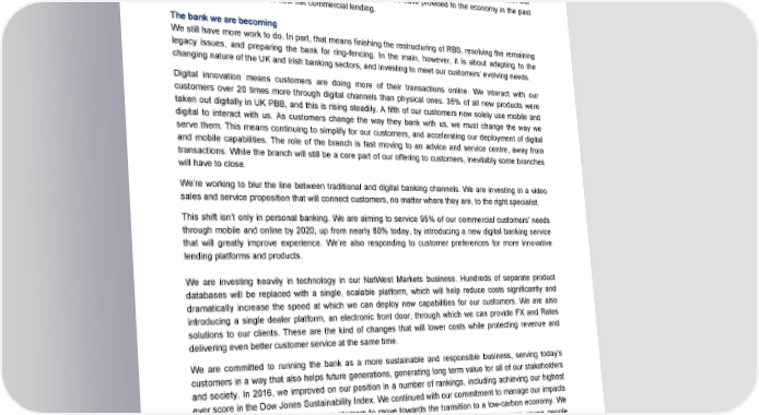 Chief Executive’s message While Q4 was down from the levels seen earlier this year, our Net Promoter Scores for Commercial and NatWest Personal in 2016 were the highest they have ever been. With £30 billion of gross new mortgage lending in UK PBB, we helped 320,000 customers with their mortgage in 2016, growing our market share for the fourth consecutive year without leading on price or risk. We are the largest commercial bank in the UK, and are ranked joint number one by Net Promoter Score. Our ability to generate value here is shown by the scale of support we have provided to the economy in the past year, with almost £9 billion of new net commercial lending. The bank we are becoming We still have more work to do. In part, that means finishing the restructuring of RBS, resolving the remaining legacy issues, and preparing the bank for ring-fencing. In the main, however, it is about adapting to the changing nature of the UK and Irish banking sectors, and investing to meet our customers’ evolving needs. Digital innovation means customers are doing more of their transactions online. We interact with our customers over 20 times more through digital channels than physical ones. 35% of all new products were taken out digitally in UK PBB, and this is rising steadily. A fifth of our customers now solely use mobile and digital to interact with us. As customers change the way they bank with us, we must change the way we serve them. This means continuing to simplify for our customers, and accelerating our deployment of digital and mobile capabilities. The role of the branch is fast moving to an advice and service centre, away from transactions. While the branch will still be a core part of our offering to customers, inevitably some branches will have to close. We’re working to blur the line between traditional and digital banking channels. We are investing in a video sales and service proposition that will connect customers, no matter where they are, to the right specialist. This shift isn’t only in personal banking. We are aiming to service 95% of our commercial customers’ needs through mobile and online by 2020, up from nearly 80% today, by introducing a new digital banking service that will greatly improve experience. We’re also responding to customer preferences for more innovative lending platforms and products. We are investing heavily in technology in our NatWest Markets business. Hundreds of separate product databases will be replaced with a single, scalable platform, which will help reduce costs significantly and dramatically increase the speed at which we can deploy new capabilities for our customers. We are also introducing a single dealer platform, an electronic front door, through which we can provide FX and Rates solutions to our clients. These are the kind of changes that will lower costs while protecting revenue and delivering even better customer service at the same time. We are committed to running the bank as a more sustainable and responsible business, serving today’s customers in a way that also helps future generations, generating long term value for all of our stakeholders and society. In 2016, we improved on our position in a number of rankings, including achieving our highest ever score in the Dow Jones Sustainability Index. We continued with our commitment to manage our impacts on climate change and support our customers to move towards the transition to a low-carbon economy. We continue to support financial education and our goal is to help a further one million more young people understand all about money by the end of 2018. 17 RBS – Annual results 2016