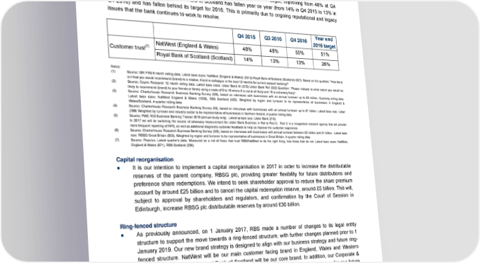 Highlights Customer Trust We also use independent experts to measure our customers’ trust in the bank. Each quarter we ask customers to what extent they trust or distrust their bank to do the right thing. The score is a net measure of those customers that trust their bank (a lot or somewhat) minus those that distrust their bank (a lot or somewhat). Customer trust in NatWest in England & Wales has exceeded its 2016 target, improving from 48% at Q4 2015 to 55% at Q4 2016. Trust in RBS in Scotland has fallen year on year (from 14% in Q4 2015 to 13% in Q4 2016) and has fallen behind its target for 2016. This is primarily due to ongoing reputational and legacy issues that the bank continues to work to resolve. Q4 2015 Q3 2016 Q4 2016 Year end 2016 target Customer trust(7) NatWest (England & Wales) 48% 48% 55% 51% Royal Bank of Scotland (Scotland) 14% 13% 13% 26% Notes: (1) Source: GfK FRS 6 month rolling data. Latest base sizes: NatWest (England & Wales) (3313) Royal Bank of Scotland (Scotland) (527). Based on the question: "How likely is it that you would recommend (brand) to a relative, friend or colleague in the next 12 months for current account banking?“ (2) Source: Coyne Research 12 month rolling data. Latest base sizes: Ulster Bank NI (375) Ulster Bank RoI (322) Question: “Please indicate to what extent you would be likely to recommend (brand) to your friends or family using a scale of 0 to 10 where 0 is not at all likely and 10 is extremely likely”. (3) Source: Charterhouse Research Business Banking Survey (GB), based on interviews with businesses with an annual turnover up to £2 million. Quarterly rolling data. Latest base sizes: NatWest England & Wales (1258), RBS Scotland (422). Weighted by region and turnover to be representative of businesses in England & Wales/Scotland, 4 quarter rolling data. (4) Source: Charterhouse Research Business Banking Survey (NI), based on interviews with businesses with an annual turnover up to £1 billion. Latest base size: Ulster (399) Weighted by turnover and industry sector to be representative of businesses in Northern Ireland, 4 quarter rolling data. (5) Source: PWC ROI Business Banking Tracker 2016 (annual study only). Latest sample size: Ulster Bank (218) In 2017 we will be switching the source of advocacy measurement for Ulster Bank Business in RoI to Red C. Red C is a recognised research agency that will provide more frequent reporting of NPS, as well as additional diagnostic customer feedback to help us improve the customer experience (6) Source: Charterhouse Research Business Banking Survey (GB), based on interviews with businesses with annual turnover between £2 million and £1 billion. Latest base size: RBSG Great Britain (935). Weighted by region and turnover to be representative of businesses in Great Britain, 4 quarter rolling data. (7) Source: Populus. Latest quarter’s data. Measured as a net of those that trust RBS/NatWest to do the right thing, less those that do not. Latest base sizes: NatWest, England & Wales (871), RBS Scotland (226). Capital reorganisation ● It is our intention to implement a capital reorganisation in 2017 in order to increase the distributable reserves of the parent company, RBSG plc, providing greater flexibility for future distributions and preference share redemptions. We intend to seek shareholder approval to reduce the share premium account by around £25 billion and to cancel the capital redemption reserve, around £5 billion. This will, subject to approval by shareholders and regulators, and confirmation by the Court of Session in Edinburgh, increase RBSG plc distributable reserves by around £30 billion. Ring-fenced structure ● As previously announced, on 1 January 2017, RBS made a number of changes to its legal entity structure to support the move towards a ring-fenced structure, with further changes planned prior to 1 January 2019. Our new brand strategy is designed to align with our business strategy and future ring- fenced structure. NatWest will be our main customer facing brand in England, Wales and Western Europe, and in Scotland, Royal Bank of Scotland will be our core brand. In addition, our Corporate & Institutional Banking business has been rebranded as NatWest Markets in readiness for our future ring-fenced structure. The ring-fenced banking group is expected to comprise of 80% of RBS risk- (1) weighted assets. Note: (1) Based on RBS future business profile business and excludes Capital Resolution. 11 RBS – Annual results 2016