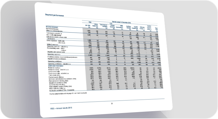Segment performance Quarter ended 31 December 2016 PBB CPB Central Ulster Commercial Private RBS NatWest Capital Williams items & Total UK PBB Bank RoI Banking Banking International Markets Resolution & Glyn (1) other (2) RBS £m £m £m £m £m £m £m £m £m £m Income statement Net interest income 1,093 105 542 111 77 29 44 170 37 2,208 Other non-interest income 246 32 325 50 19 285 (329) 47 446 1,121 Total income adjusted (3) 1,339 137 867 161 96 314 (285) 217 483 3,329 Own credit adjustments - - - - - (29) (8) - (77) (114) Gain on redemption of own debt - - - - - - - - 1 1 Total income 1,339 137 867 161 96 285 (293) 217 407 3,216 Direct expenses - staff costs (161) (57) (130) (39) (12) (64) (23) (60) (479) (1,025) - other costs (72) (23) (69) (12) (4) (7) (3) (13) (991) (1,194) Indirect expenses (544) (65) (357) (95) (45) (267) (150) (24) 1,547 - Operating expenses - adjusted (4) (777) (145) (556) (146) (61) (338) (176) (97) 77 (2,219) Restructuring costs - direct (1) (6) (12) (6) (1) (3) (21) - (957) (1,007) - indirect (50) 2 (34) (8) (1) (43) 13 - 121 - Litigation and conduct costs (214) (77) (407) 1 (1) (466) (3,156) - 192 (4,128) Operating expenses (1,042) (226) (1,009) (159) (64) (850) (3,340) (97) (567) (7,354) Profit/(loss) before impairment (losses)/releases 297 (89) (142) 2 32 (565) (3,633) 120 (160) (4,138) Impairment (losses)/releases (16) 47 (83) 8 1 - 130 (11) (1) 75 Operating profit/(loss) 281 (42) (225) 10 33 (565) (3,503) 109 (161) (4,063) Operating profit/(loss) - adjusted (3,4) 546 39 228 23 36 (24) (331) 109 559 1,185 Additional information Return on equity (5) 13.5% (5.8%) (9.1%) 1.6% 8.8% (30.2%) nm nm nm (48.2%) Return on equity - adjusted (3,4,5) 27.8% 5.4% 5.3% 4.5% 9.8% (2.7%) nm nm nm 8.6% Cost:income ratio 78% 165% 116% 99% 67% nm nm 45% nm 229% Cost:income ratio - adjusted (3,4) 58% 106% 64% 91% 64% 108% nm 45% nm 67% Total assets (£bn) 155.6 24.1 150.5 18.6 23.4 240.0 132.5 25.8 28.2 798.7 Funded assets (£bn) (6) 155.6 24.0 150.5 18.5 23.4 100.9 27.6 25.8 25.4 551.7 Net loans and advances to customers (£bn) 132.1 18.9 100.1 12.2 8.8 17.4 12.8 20.6 0.1 323.0 Risk elements in lending (£bn) 2.0 3.5 1.9 0.1 0.1 - 2.3 0.4 - 10.3 Impairment provisions (£bn) (1.3) (1.2) (0.8) - - - (0.8) (0.2) (0.2) (4.5) Customer deposits (£bn) 145.8 16.1 97.9 26.6 25.2 8.4 9.5 24.2 0.2 353.9 Risk-weighted assets (RWAs) (£bn) 32.7 18.1 78.5 8.6 9.5 35.2 34.5 9.6 1.5 228.2 RWA equivalent (£bn) (5) 35.7 19.5 82.6 8.6 9.5 37.2 37.5 10.1 1.7 242.4 Employee numbers (FTEs - thousands) 18.3 3.1 5.5 1.7 0.8 1.2 0.4 4.5 42.3 77.8 For the notes to table refer to page 34. nm = not meaningful. 31 RBS – Annual results 2016