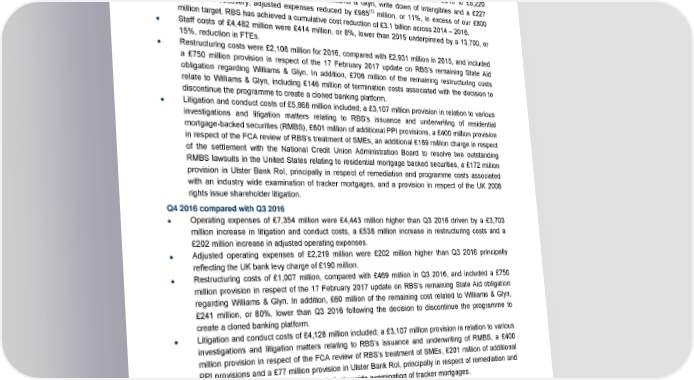 Analysis of results Key points 2016 compared with 2015 Operating expenses of £16,194 million were £159 million, or 1%, lower than 2015 reflecting a £1,136 million, or 12%, reduction in adjusted operating expenses and a £825 million, or 28%, reduction in restructuring costs. In addition, 2015 included a £498 million write down of goodwill relating to Private Banking. Partially offsetting the above, litigation and conduct costs increased by £2,300 million. Adjusted operating expenses reduced by £1,136 million, or 12%, compared with 2015 to £8,220 million. Excluding expenses associated with Williams & Glyn, write down of intangibles and a £227 million VAT recovery, adjusted expenses reduced by £985(1) million, or 11%, in excess of our £800 million target. RBS has achieved a cumulative cost reduction of £3.1 billion across 2014 – 2016. Staff costs of £4,482 million were £414 million, or 8%, lower than 2015 underpinned by a 13,700, or 15%, reduction in FTEs. Restructuring costs were £2,106 million for 2016, compared with £2,931 million in 2015, and included a £750 million provision in respect of the 17 February 2017 update on RBS’s remaining State Aid obligation regarding Williams & Glyn. In addition, £706 million of the remaining restructuring costs relate to Williams & Glyn, including £146 million of termination costs associated with the decision to discontinue the programme to create a cloned banking platform. Litigation and conduct costs of £5,868 million included; a £3,107 million provision in relation to various investigations and litigation matters relating to RBS’s issuance and underwriting of residential mortgage-backed securities (RMBS), £601 million of additional PPI provisions, a £400 million provision in respect of the FCA review of RBS’s treatment of SMEs, an additional £169 million charge in respect of the settlement with the National Credit Union Administration Board to resolve two outstanding RMBS lawsuits in the United States relating to residential mortgage backed securities, a £172 million provision in Ulster Bank RoI, principally in respect of remediation and programme costs associated with an industry wide examination of tracker mortgages, and a provision in respect of the UK 2008 rights issue shareholder litigation. Q4 2016 compared with Q3 2016 Operating expenses of £7,354 million were £4,443 million higher than Q3 2016 driven by a £3,703 million increase in litigation and conduct costs, a £538 million increase in restructuring costs and a £202 million increase in adjusted operating expenses. Adjusted operating expenses of £2,219 million were £202 million higher than Q3 2016 principally reflecting the UK bank levy charge of £190 million. Restructuring costs of £1,007 million, compared with £469 million in Q3 2016, and included a £750 million provision in respect of the 17 February 2017 update on RBS’s remaining State Aid obligation regarding Williams & Glyn. In addition, £60 million of the remaining cost related to Williams & Glyn, £241 million, or 80%, lower than Q3 2016 following the decision to discontinue the programme to create a cloned banking platform. Litigation and conduct costs of £4,128 million included; a £3,107 million provision in relation to various investigations and litigation matters relating to RBS’s issuance and underwriting of RMBS, a £400 million provision in respect of the FCA review of RBS’s treatment of SMEs, £201 million of additional PPI provisions and a £77 million provision in Ulster Bank RoI, principally in respect of remediation and programme costs associated with an industry wide examination of tracker mortgages. Q4 2016 compared with Q4 2015 Operating expenses of £7,354 million were £1,593 million higher than Q4 2015 reflecting a £2,004 million increase in litigation and conduct costs and a £393 million increase in restructuring costs, partially offset by a £498 million write down of goodwill in Q4 2015 and a £306 million reduction in adjusted operating expenses, principally driven by a £218 million reduction in Capital Resolution. Note: (1) Operating expenses excluding restructuring costs £2,106 million (2015 - £2,931 million), litigation and conduct costs £5,868 million (2015 - £3,568 million), write down of goodwill nil (2015 - £498 million), write down of other intangible assets of £117 million (2015 - £75 million), the operating costs of Williams and Glyn £393 million (2015 - £359 million) and the VAT recovery £227 million in 2016. 25 RBS – Annual results 2016