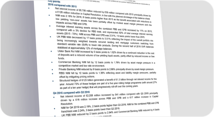 Analysis of results Notes: (1) For the purpose of net interest margin (NIM) calculations, no decrease for 2016 (2015 - £15 million) and no decrease for Q4 2016 (Q3 2016 – nil; Q4 2015 - £3 million) was made in respect of interest on financial assets and liabilities designated as at fair value through profit or loss. Related average interest-earning assets and average interest-bearing liabilities have also been adjusted. (2) For the purpose of calculating gross yields and interest spread, interest receivable and interest payable have both been decreased by £76 million in respect of negative interest relating to financial assets that attracted negative interest. (3) Gross yield is the interest earned on average interest-earning assets as a percentage of average interest-earning assets. (4) Interest spread is the difference between the gross yield and interest paid on average interest-bearing liabilities as a percentage of average interest-bearing liabilities. (5) Net interest margin is net interest income as a percentage of average interest-earning assets. (6) PBB NIM for the year ended 2016 was 2.80% (year ended 2015 - 2.93%; Q4 2016 - 2.74%; Q3 2016 - 2.76%; Q4 2015 - 2.80%). CPB NIM for the year ended 2016 was 1.80% (year ended 2015 - 1.92%; Q4 2016 - 1.72%; Q3 2016 - 1.75%; Q4 2015 - 1.87%). (7) Net interest margin includes Treasury allocations and interest on intercompany borrowings, which are excluded from third party customer rates. (8) Ulster Bank Ireland DAC manages its funding and liquidity requirements locally. Its liquid asset portfolios and non-customer related funding sources are included within its net interest margin, but excluded from its third party asset and liability rates. Key points 2016 compared with 2015 Net interest income of £8,708 million reduced by £59 million compared with 2015 principally driven by a £126 million reduction in Capital Resolution, in line with the planned shrinkage of the balance sheet. NIM was 2.18% for 2016, 6 basis points higher than 2015 as the benefit associated with reductions in low yielding ‘non-core’ assets has been partially offset by modest asset margin pressure and mix impacts across PBB and CPB. Average interest earning assets across the combined PBB and CPB increased by 11% on 2015, compared with a 3% decline for RBS total, and represented 82% of total average interest earning assets (2015 - 72%). NIM across PBB and CPB was 2.31%, 13 basis points lower than 2015. UK PBB NIM decreased by 17 basis points to 3.01% reflecting the impact of the overall portfolio mix being increasingly weighted towards secured lending and mortgage customers switching from standard variable rate (SVR) to lower rate products. During the second half of 2016 SVR balances stabilised at approximately 12% of mortgage balances. Ulster Bank RoI NIM increased by 5 basis points to 1.62% driven by a continued reduction in the cost of deposits and a reduced volume of low yielding liquid assets, partly offset by reduced income on free funds. Commercial Banking NIM fell by 12 basis points to 1.76% driven by asset margin pressure in a competitive market and low rate environment. Private Banking NIM reduced by 9 basis points to 2.66% principally driven by asset margin pressure. RBSI NIM fell by 12 basis points to 1.36% reflecting asset and liability margin pressures, partially offset by mitigating pricing actions. Structural hedges of £123 billion generated a benefit of £1.3 billion through net interest income for the year. Around 73% of these hedges are part of a five year rolling hedge programme (with around 27% as part of a ten year hedge) that will progressively roll-off over the coming years. Q4 2016 compared with Q3 2016 Net interest income of £2,208 million increased by £41 million compared with Q3 2016 principally driven by a £16 million increase across PBB and CPB and a £17 million increase in Capital Resolution. NIM for Q4 2016 was 2.19%, 2 basis points higher than Q3 2016. NIM for the combined PBB and CPB franchises was 2.24%, 3 basis points lower than Q3 2016. UK PBB NIM reduced by 2 basis points to 2.94% and Commercial Banking NIM reduced by 4 basis points to 1.68% driven by asset margin pressure. Q4 2016 compared with Q4 2015 Net interest income of £2,208 million increased by £46 million compared with Q4 2015 principally driven by a £115 million increase across PBB and CPB. NIM was 2.19% for Q4 2016, 9 basis points higher than Q4 2015 as the benefit associated with reductions in low yielding ‘non-core’ assets has been partially offset by modest asset margin pressure and mix impacts across PBB and CPB. 22 RBS – Annual results 2016