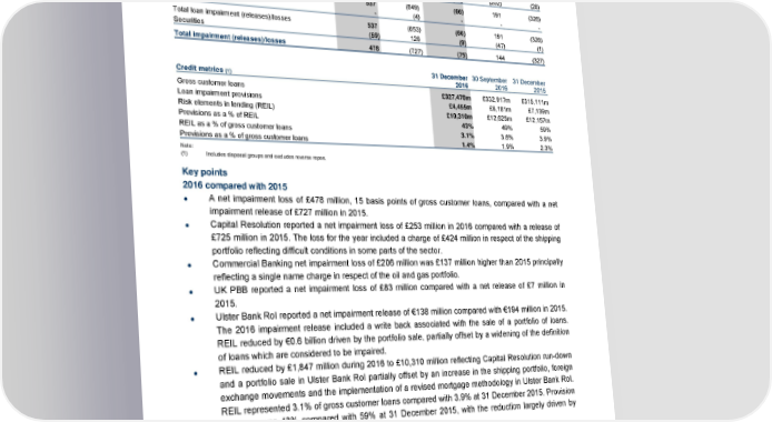 Analysis of results Year ended Quarter ended 31 December 31 December 31 December 30 September 31 December 2016 2015 2016 2016 2015 Impairment (releases)/losses £m £m £m £m £m Loan impairment (releases)/losses - individually assessed 535 (406) (40) 217 (271) - collectively assessed 218 (35) (1) 176 (27) - latent (216) (408) (25) (202) (28) Customer loans 537 (849) (66) 191 (326) Bank loans - (4) - - - Total loan impairment (releases)/losses 537 (853) (66) 191 (326) Securities (59) 126 (9) (47) (1) Total impairment (releases)/losses 478 (727) (75) 144 (327) 31 December 30 September 31 December Credit metrics (1) 2016 2016 2015 Gross customer loans £327,478m £332,917m £315,111m Loan impairment provisions £4,455m £6,181m £7,139m Risk elements in lending (REIL) £10,310m £12,625m £12,157m Provisions as a % of REIL 43% 49% 59% REIL as a % of gross customer loans 3.1% 3.8% 3.9% Provisions as a % of gross customer loans 1.4% 1.9% 2.3% Note: (1) Includes disposal groups and excludes reverse repos. Key points 2016 compared with 2015 A net impairment loss of £478 million, 15 basis points of gross customer loans, compared with a net impairment release of £727 million in 2015. Capital Resolution reported a net impairment loss of £253 million in 2016 compared with a release of £725 million in 2015. The loss for the year included a charge of £424 million in respect of the shipping portfolio reflecting difficult conditions in some parts of the sector. Commercial Banking net impairment loss of £206 million was £137 million higher than 2015 principally reflecting a single name charge in respect of the oil and gas portfolio. UK PBB reported a net impairment loss of £83 million compared with a net release of £7 million in 2015. Ulster Bank RoI reported a net impairment release of €138 million compared with €194 million in 2015. The 2016 impairment release included a write back associated with the sale of a portfolio of loans. REIL reduced by €0.6 billion driven by the portfolio sale, partially offset by a widening of the definition of loans which are considered to be impaired. REIL reduced by £1,847 million during 2016 to £10,310 million reflecting Capital Resolution run-down and a portfolio sale in Ulster Bank RoI partially offset by an increase in the shipping portfolio, foreign exchange movements and the implementation of a revised mortgage methodology in Ulster Bank RoI. REIL represented 3.1% of gross customer loans compared with 3.9% at 31 December 2015. Provision coverage was 43% compared with 59% at 31 December 2015, with the reduction largely driven by Ulster Bank RoI and Capital Resolution. Excluding Ulster Bank RoI and Capital Resolution, REIL represented 1.5% of gross customer loans, compared with 2.0% at end 2015, and provision coverage was 54% compared with 56% in 2015. 26 RBS – Annual results 2016