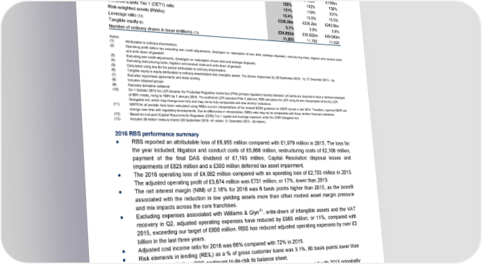 Highlights 31 December 30 September 31 December Balance sheet related key metrics and ratios 2016 2016 2015 Tangible net asset value (TNAV) per ordinary share (6) 296p 338p 352p Loan:deposit ratio (7,8) 91% 91% 89% Short-term wholesale funding (7,9) £14bn £14bn £17bn Wholesale funding (7,9) £59bn £56bn £59bn Liquidity portfolio £164bn £149bn £156bn Liquidity coverage ratio (LCR) (10) 123% 112% 136% Net stable funding ratio (NSFR) (11) 121% 119% 121% Common Equity Tier 1 (CET1) ratio 13.4% 15.0% 15.5% Risk-weighted assets (RWAs) £228.2bn £235.2bn £242.6bn Leverage ratio (12) 5.1% 5.6% 5.6% Tangible equity (6) £34,982m £39,822m £40,943m Number of ordinary shares in issue (millions) (13) 11,823 11,792 11,625 Notes: (1) Attributable to ordinary shareholders. (2) Operating profit before tax excluding own credit adjustments, (loss)/gain on redemption of own debt, strategic disposals, restructuring costs, litigation and conduct costs and write down of goodwill. (3) Excluding own credit adjustments, (loss)/gain on redemption of own debt and strategic disposals. (4) Excluding restructuring costs, litigation and conduct costs and write down of goodwill. (5) Calculated using loss for the period attributable to ordinary shareholders. (6) Tangible equity is equity attributable to ordinary shareholders less intangible assets. The dilutive impact was 2p (30 September 2016 - 1p; 31 December 2015 - 1p). (7) Excludes repurchase agreements and stock lending. (8) Includes disposal groups. (9) Excludes derivative collateral. (10) On 1 October 2015 the LCR became the Prudential Regulation Authority’s (PRA) primary regulatory liquidity standard; UK banks are required to meet a minimum standard of 80% initally, rising to 100% by 1 January 2018. The published LCR excludes Pillar 2 add-ons. RBS calculates the LCR using its own interpretation of the EU LCR Delegated Act, which may change over time and may not be fully comparable with that of other institutions. (11) NSFR for all periods have been calculated using RBS’s current interpretations of the revised BCBS guidance on NSFR issued in late 2014. Therefore, reported NSFR will change over time with regulatory developments. Due to differences in interpretation, RBS’s ratio may not be comparable with those of other financial institutions. (12) Based on end-point Capital Requirements Regulation (CRR) Tier 1 capital and leverage exposure under the CRR Delegated Act. (13) Includes 39 million treasury shares (30 September 2016 - 41 million; 31 December 2015 - 26 million). 2016 RBS performance summary ● RBS reported an attributable loss of £6,955 million compared with £1,979 million in 2015. The loss for the year included; litigation and conduct costs of £5,868 million, restructuring costs of £2,106 million, payment of the final DAS dividend of £1,193 million, Capital Resolution disposal losses and impairments of £825 million and a £300 million deferred tax asset impairment. ● The 2016 operating loss of £4,082 million compared with an operating loss of £2,703 million in 2015. The adjusted operating profit of £3,674 million was £731 million, or 17%, lower than 2015. ● The net interest margin (NIM) of 2.18% for 2016 was 6 basis points higher than 2015, as the benefit associated with the reduction in low yielding assets more than offset modest asset margin pressure and mix impacts across the core franchises. ● Excluding expenses associated with Williams & Glyn(1), write-down of intangible assets and the VAT recovery in Q2, adjusted operating expenses have reduced by £985 million, or 11%, compared with 2015, exceeding our target of £800 million. RBS has reduced adjusted operating expenses by over £3 billion in the last three years. ● Adjusted cost income ratio for 2016 was 66% compared with 72% in 2015. ● Risk elements in lending (REIL) as a % of gross customer loans was 3.1%, 80 basis points lower than 31 December 2015 as RBS continues to de-risk its balance sheet. ● Tangible net asset value (TNAV) per share decreased by 56p to 296p compared with 2015 principally reflecting the attributable loss for the year. 4 RBS – Annual results 2016