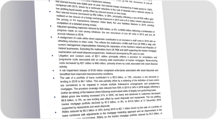 Segment performance Ulster Bank RoI 2016 compared with 2015 ● Operating profit decreased by €338 million to €24 million compared with 2015 primarily due to an increase in litigation and conduct costs of €229 million and a €56 million reduction in net impairment releases. Adjusted operating profit of €280 million was €85 million, or 23%, lower than prior year as a reduction in adjusted operating expenses was more than offset by the non recurrence of one-off income benefits in 2015 and lower impairment releases. ● Net interest income was stable year on year. Net interest margin increased by 5 basis points to 1.62%, compared with 2015, driven by a continued reduction in the cost of deposits and a reduced volume of low yielding liquid assets, partly offset by reduced income on free funds. ● Non interest income decreased by €52 million, or 20%, principally reflecting a one-off €33 million gain realised on the closure of a foreign exchange exposure in 2015 and a €13 million interim adjustment to the pricing of FX transactions between Ulster Bank RoI and NatWest Markets in 2016, pending completion of a detailed pricing review. ● Adjusted operating expenses reduced by €28 million, or 5%, to €559 million reflecting a combination of progress made on cost saving initiatives, the non recurrence of one off costs in 2015 and one off accrual releases in 2016. ● A realignment of costs within direct expenses contributed to an increase in staff costs in 2016 with an offsetting reduction in other costs. This reflects the reallocation of 660 staff from UK PBB to align with current management responsibilities following the separation of the Northern Ireland and Republic of Ireland businesses. Excluding the reallocation from UK PBB and staff supporting the tracker mortgage examination and asset disposal programmes, headcount decreased by 9% year on year. ● Litigation and conduct costs of €211 million principally reflects a provision for remediation and programme costs associated with an industry wide examination of tracker mortgages. Restructuring costs increased by €27 million to €48 million, primarily driven by costs associated with asset disposal activity. ● A net impairment release of €138 million comprised write-backs associated with asset disposals and benefited from improved macroeconomic conditions. ● The sale of a portfolio of loans contributed to a €0.6 billion, or 13%, reduction in risk elements in lending in 2016 to €4.1 billion. This was partially offset by a widening of the definition of loans which are considered to be impaired to include multiple forbearance arrangements and probationary mortgages. The provision coverage ratio reduced from 55% in 2015 to 34% in 2016 largely reflecting a further de-risking of the balance sheet following recent asset sales of largely non-performing loans. ● Whilst gross new lending increased 31% in 2016, net loans and advances to customers decreased €0.6 billion, or 3%, as new lending was offset by asset disposals and repayments. The low yielding tracker mortgage portfolio declined by €1.0 billion, or 9%, to €10.8 billion at 31 December 2016 supported by repayments and asset disposals. ● RWAs reduced by €5.3 billion or 20% during 2016 to €21.1 billion driven by the sale of a portfolio of loans combined with adjustments to the mortgage modelling approach and an improvement in the macro economic environment. RWAs on the tracker mortgage portfolio reduced by €3.3 billion, or 31%, during 2016 to €7.4 billion. ● Loan:deposit ratio decreased 10 percentage points to 117% in 2016 supported by a €1.0 billion growth in deposits and reduced net loans following recent asset sales. 40 RBS – Annual results 2016