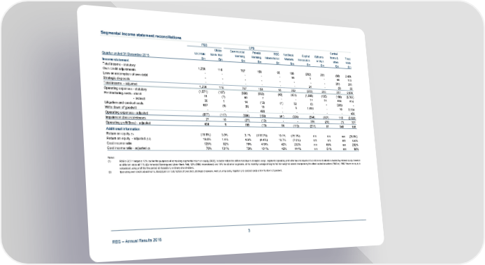Segmental income statement reconciliations PBB CPB Central Ulster Commercial Private RBS NatWest Capital Williams items & Total UK PBB Bank RoI Banking Banking International Markets Resolution & Glyn other RBS Quarter ended 31 December 2015 £m £m £m £m £m £m £m £m £m £m Income statement Total income - statutory 1,254 116 797 158 95 186 (262) 208 (68) 2,484 Own credit adjustments - - - - - 66 5 - 44 115 Loss on redemption of own debt - - - - - - - - 263 263 Strategic disposals - - - - - - 24 - (2) 22 Total income - adjusted 1,254 116 797 158 95 252 (233) 208 237 2,884 Operating expenses - statutory (1,571) (107) (630) (662) (40) (431) (1,996) (135) (189) (5,761) Restructuring costs - direct 31 (7) 40 7 - - 21 28 494 614 - indirect 56 1 14 (12) (1) 62 83 - (203) - Litigation and conduct costs 607 (4) (8) 10 - 5 1,498 - 16 2,124 Write down of goodwill - - - 498 - - - - - 498 Operating expenses - adjusted (877) (117) (584) (159) (41) (364) (394) (107) 118 (2,525) Impairment (losses)/releases 27 10 (27) (12) - - 356 (20) (7) 327 Operating profit/(loss) - adjusted 404 9 186 (13) 54 (112) (271) 81 348 686 Additional information Return on equity (1) (16.8%) 3.0% 3.1% (118.9%) 19.1% (15.1%) nm nm nm (26.5%) Return on equity - adjusted (1,2) 19.8% 1.4% 4.6% (4.4%) 18.7% (7.6%) nm nm nm 6.6% Cost income ratio 125% 92% 79% 419% 42% 232% nm 65% nm 232% Cost income ratio - adjusted (2) 70% 101% 73% 101% 43% 144% nm 51% nm 88% Notes: (1) RBS’s CET 1 target is 13% but for the purposes of computing segmental return on equity (ROE), to better reflect the differential drivers of capital usage, segmental operating profit after tax and adjusted for preference dividends is divided by notional equity allocated at different rates of 11% (Commercial Banking and Ulster Bank RoI), 12% (RBS International) and 15% for all other segments, of the monthly average of segmental risk-weighted assets incorporating the effect capital deductions (RWAes). RBS Return on equity is calculated using profit for the period attributable to ordinary shareholders. (2) Excluding own credit adjustments, (loss)/gain on redemption of own debt, strategic disposals, restructuring costs, litigation and conduct costs and write down of goodwill. RBS – Annual Results 2016 3