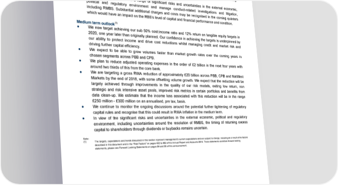Highlights ● We are targeting a CET1 ratio of at least 13% at the end of 2017. As part of the 2016 Bank of England stress testing exercise, RBS submitted a revised capital plan, incorporating further capital strengthening actions, which was accepted by the PRA Board. ● RBS issuance plans for 2017 focus on issuing £3-£5 billion MREL-compliant Senior holding company (RBSG) securities. We do not currently anticipate the need for either AT1 or Tier 2 issuances. In addition, and reflecting our strategic progress, we also target a progressive return to other funding markets to support our lending growth. ● RBS continues to deal with a range of significant risks and uncertainties in the external economic, political and regulatory environment and manage conduct-related investigations and litigation, including RMBS. Substantial additional charges and costs may be recognised in the coming quarters which would have an impact on the RBS’s level of capital and financial performance and condition. Medium term outlook(1) ● We now target achieving our sub 50% cost:income ratio and 12% return on tangible equity targets in 2020, one year later than originally planned. Our confidence in achieving the targets is underpinned by our ability to protect income and drive cost reductions whilst managing credit and market risk and driving further capital efficiency. ● We expect to be able to grow volumes faster than market growth rates over the coming years in chosen segments across PBB and CPB. ● We plan to reduce adjusted operating expenses in the order of £2 billion in the next four years with around two thirds of this from the core bank. ● We are targeting a gross RWA reduction of approximately £20 billion across PBB, CPB and NatWest Markets by the end of 2018, with some offsetting volume growth. We expect that the reduction will be largely achieved through improvements in the quality of our risk models, exiting low return, non strategic and risk intensive asset pools, improved risk metrics in certain portfolios and benefits from data clean-up. We estimate that the income loss associated with this reduction will be in the range £250 million - £300 million on an annualised, pre tax, basis. ● We continue to monitor the ongoing discussions around the potential further tightening of regulatory capital rules and recognise that this could result in RWA inflation in the medium term. ● In view of the significant risks and uncertainties in the external economic, political and regulatory environment, including uncertainties around the resolution of RMBS, the timing of returning excess capital to shareholders through dividends or buybacks remains uncertain. Note: (1) The targets, expectations and trends discussed in this section represent management’s current expectations and are subject to change, including as a result of the factors described in this document and in the “Risk Factors” on pages 432 to 463 of the Annual Report and Accounts 2016. These statements constitute forward looking statements, please see Forward Looking Statements on pages 64 and 65 of this announcement. 14 RBS – Annual results 2016