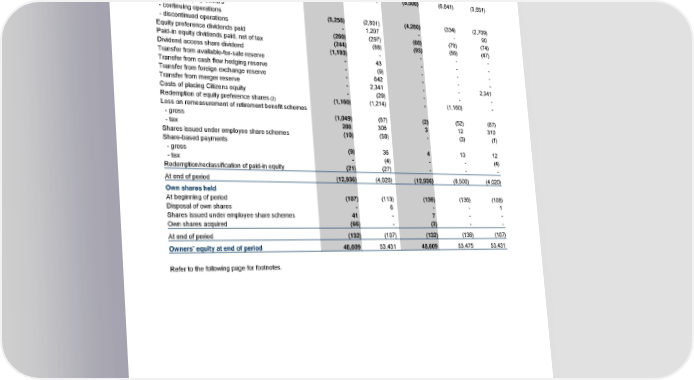 Statutory results Condensed consolidated statement of changes in equity for the period ended 31 December 2016 Year ended Quarter ended 31 December 31 December 31 December 30 September 31 December 2016 2015 2016 2016 2015 £m £m £m £m £m Retained earnings At beginning of period (4,020) (4,001) (8,500) (6,841) (3,851) (Loss)/profit attributable to ordinary shareholders and other equity owners - continuing operations (5,258) (2,801) (4,280) (334) (2,709) - discontinued operations - 1,207 - - 90 Equity preference dividends paid (260) (297) (68) (79) (74) Paid-in equity dividends paid, net of tax (244) (88) (93) (56) (47) Dividend access share dividend (1,193) - - - - Transfer from available-for-sale reserve - 43 - - - Transfer from cash flow hedging reserve - (9) - - - Transfer from foreign exchange reserve - 642 - - - Transfer from merger reserve - 2,341 - - 2,341 Costs of placing Citizens equity - (29) - - - Redemption of equity preference shares (2) (1,160) (1,214) - (1,160) - Loss on remeasurement of retirement benefit schemes - gross (1,049) (67) (2) (52) (87) - tax 288 306 3 12 310 Shares issued under employee share schemes (10) (58) - (3) (1) Share-based payments - gross (9) 36 4 13 12 - tax - (4) - - (4) Redemption/reclassification of paid-in equity (21) (27) - - - At end of period (12,936) (4,020) (12,936) (8,500) (4,020) Own shares held At beginning of period (107) (113) (136) (136) (108) Disposal of own shares - 6 - - 1 Shares issued under employee share schemes 41 - 7 - - Own shares acquired (66) - (3) - - At end of period (132) (107) (132) (136) (107) Owners’ equity at end of period 48,609 53,431 48,609 53,475 53,431 Refer to the following page for footnotes. 52 RBS – Annual results 2016