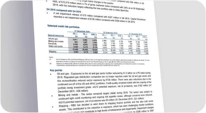 Analysis of results Key points (continued) Q4 2016 compared with Q3 2016 A net impairment release of £75 million compared with a net impairment charge of £144 million in Q3 2016. Capital Resolution reported a net impairment release of £130 million compared with a net impairment charge of £120 million in Q3 2016. Commercial Banking reported a net impairment loss of £83 million compared with £20 million in Q3 2016, with the uplift reflecting single name charges in the quarter. REIL of £10,310 million were 3.1% of gross customer loans compared with 3.8% as at 30 September 2016, with the reduction largely reflecting the loan portfolio sale in Ulster Bank RoI. Q4 2016 compared with Q4 2015 A net impairment release of £75 million compared with £327 million in Q4 2015. Capital Resolution reported a net impairment release of £130 million compared with £356 million in Q4 2015. Selected credit risk portfolios 31 December 2016 30 September 2016 31 December 2015 CE (1) PE (1) EAD (2) CE (1) PE (1) EAD (2) CE (1) PE (1) EAD (2) Natural resources £m £m £m £m £m £m £m £m £m Oil and gas 2,911 5,286 4,278 2,989 6,000 4,739 3,544 6,798 5,606 Mining and metals 623 1,887 1,344 652 1,782 1,375 729 1,823 1,555 Electricity 3,430 9,076 6,143 3,256 8,466 5,782 2,851 7,683 5,205 Water and waste 5,436 9,176 6,779 5,875 8,772 7,381 4,657 8,261 5,873 12,400 25,425 18,544 12,772 25,020 19,277 11,781 24,565 18,239 Shipping 4,553 5,173 5,035 5,514 6,043 6,154 6,776 7,301 7,509 Notes: (1) Current Exposure (CE) and Potential Exposure (PE) are both net of impairment provisions and credit valuation adjustments and after the effect of risk transfer. For a full description of what is included and excluded from Current and Potential Exposure refer to page 209 of the 2016 Annual Report and Accounts. (2) Exposure at default (EAD) reflects an estimate of the extent to which a bank will be exposed under a specific facility on the default of a customer or counterparty. Uncommitted undrawn facilities are excluded from CE but included within EAD; therefore EAD can exceed CE. Key points Oil and gas - Exposures to the oil and gas sector further reduced by £1.5 billion on a PE basis during 2016. Regulated gas distribution companies are no longer reported under the oil and gas sector and this reclassification reduced sector exposure by £724 million. There were also reductions due to the continued run-off of the US and APAC portfolios. Credit quality remained stable with the majority of the portfolio being investment grade. AQ10 potential exposure, net of provisions, was £182 million (31 December 2015 - £38 million). Mining and metals - The sector remained largely stable during 2016. The sector was subject to continued tight credit monitoring and ongoing risk appetite review, although concerns have reduced. AQ10 potential exposure, net of provisions was £3 million (31 December 2015 - £21 million). Shipping - RBS has decided to wind down its shipping finance portfolio and has also sold some assets. This contributed to the reduction in exposure, which has seen challenging market conditions affect vessel values and contribute to high levels of forbearance and impairments. Impairment charges of £424 million partially offset by write offs in 2016, increasing provisions by £206 million to £387 million (30 September 2016 - £565 million; 31 December 2015 - £181 million). AQ10 exposure, net of provisions, was £952 million (30 September 2016 - £1,031 million; 31 December 2015 - £239 million). In addition £363 million of current exposure was classified as at risk of credit loss (30 September 2016 - £775 million). 27 RBS – Annual results 2016