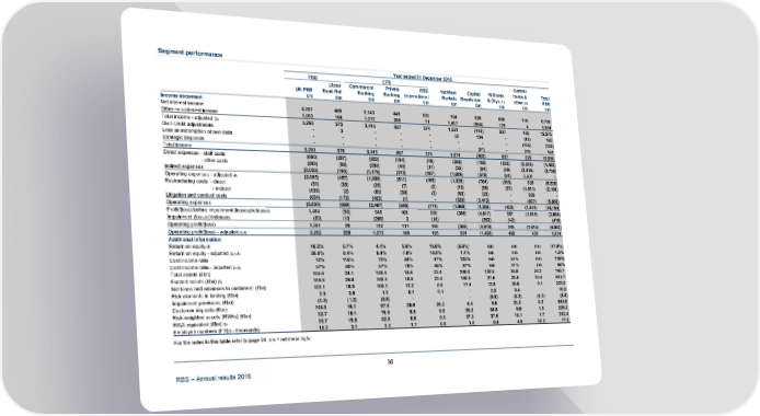 Segment performance Year ended 31 December 2016 PBB CPB Central Ulster Commercial Private RBS NatWest Capital Williams items & Total UK PBB Bank RoI Banking Banking International Markets Resolution & Glyn (1) other (2) RBS £m £m £m £m £m £m £m £m £m £m Income statement Net interest income 4,287 409 2,143 449 303 104 239 658 116 8,708 Other non-interest income 1,003 164 1,272 208 71 1,417 (654) 179 4 3,664 Total income - adjusted (3) 5,290 573 3,415 657 374 1,521 (415) 837 120 12,372 Own credit adjustments - 3 - - - 53 134 - (10) 180 Loss on redemption of own debt - - - - - - - - (126) (126) Strategic disposals - - - - - - (81) - 245 164 Total income 5,290 576 3,415 657 374 1,574 (362) 837 229 12,590 Direct expenses - staff costs (690) (207) (522) (154) (45) (256) (102) (250) (2,256) (4,482) - other costs (293) (55) (235) (44) (17) (35) (84) (59) (2,916) (3,738) Indirect expenses (2,022) (195) (1,179) (313) (107) (1,029) (578) (84) 5,507 - Operating expenses - adjusted (4) (3,005) (457) (1,936) (511) (169) (1,320) (764) (393) 335 (8,220) Restructuring costs - direct (51) (38) (25) (7) (2) (19) (56) (57) (1,851) (2,106) - indirect (136) (2) (83) (30) (3) (93) (22) - 369 - Litigation and conduct costs (634) (172) (423) (1) - (528) (3,413) - (697) (5,868) Operating expenses (3,826) (669) (2,467) (549) (174) (1,960) (4,255) (450) (1,844) (16,194) Profit/(loss) before impairment (losses)/releases 1,464 (93) 948 108 200 (386) (4,617) 387 (1,615) (3,604) Impairment (losses)/releases (83) 113 (206) 3 (10) - (253) (42) - (478) Operating profit/(loss) 1,381 20 742 111 190 (386) (4,870) 345 (1,615) (4,082) Operating profit/(loss) - adjusted (3,4) 2,202 229 1,273 149 195 201 (1,432) 402 455 3,674 Additional information Return on equity (5) 16.2% 0.7% 4.1% 5.6% 13.8% (6.6%) nm nm nm (17.9%) Return on equity - adjusted (3,4,5) 26.8% 8.4% 8.4% 7.8% 14.2% 1.1% nm nm nm 1.6% Cost:income ratio 72% 116% 72% 84% 47% 125% nm 54% nm 129% Cost:income ratio - adjusted (3,4) 57% 80% 57% 78% 45% 87% nm 47% nm 66% Total assets (£bn) 155.6 24.1 150.5 18.6 23.4 240.0 132.5 25.8 28.2 798.7 Funded assets (£bn) (6) 155.6 24.0 150.5 18.5 23.4 100.9 27.6 25.8 25.4 551.7 Net loans and advances to customers (£bn) 132.1 18.9 100.1 12.2 8.8 17.4 12.8 20.6 0.1 323.0 Risk elements in lending (£bn) 2.0 3.5 1.9 0.1 0.1 - 2.3 0.4 - 10.3 Impairment provisions (£bn) (1.3) (1.2) (0.8) - - - (0.8) (0.2) (0.2) (4.5) Customer deposits (£bn) 145.8 16.1 97.9 26.6 25.2 8.4 9.5 24.2 0.2 353.9 Risk-weighted assets (RWAs) (£bn) 32.7 18.1 78.5 8.6 9.5 35.2 34.5 9.6 1.5 228.2 RWA equivalent (£bn) (5) 35.7 19.5 82.6 8.6 9.5 37.2 37.5 10.1 1.7 242.4 Employee numbers (FTEs - thousands) 18.3 3.1 5.5 1.7 0.8 1.2 0.4 4.5 42.3 77.8 For the notes to this table refer to page 34. nm = not meaningful 30 RBS – Annual results 2016