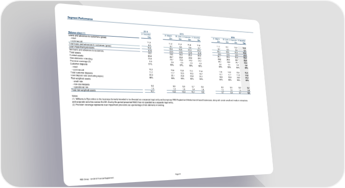 Segment Performance 2014 2015 2016 31 December 31 March 30 June 30 September 31 December 31 March 30 June 30 September 31 December Balance sheet (1) £bn £bn £bn £bn £bn £bn £bn £bn £bn Loans and advances to customers (gross) - retail 11,3 11,2 11,2 11,4 11,6 11,7 12,1 12,2 12,3 - commercial 8,6 8,7 8,6 8,9 8,7 8,7 8,5 8,6 8,5 Total loans and advances to customers (gross) 19,9 19,9 19,8 20,3 20,3 20,4 20,6 20,8 20,8 Loan impairment provisions (0,4) (0,4) (0,3) (0,3) (0,3) (0,3) (0,3) (0,2) (0,2) Net loans and advances to customers 19,5 19,5 19,5 20,0 20,0 20,1 20,3 20,6 20,6 Total assets 23,6 23,7 23,9 24,0 24,1 24,2 24,9 25,7 25,8 Funded assets 23,6 23,7 23,9 24,0 24,1 24,2 24,9 25,7 25,8 Risk elements in lending 0,6 0,6 0,5 0,5 0,5 0,4 0,4 0,4 0,4 Provision coverage (2) 61% 65% 67% 59% 60% 65% 66% 64% 65% Customer deposits - retail 10,3 10,4 10,9 11,1 11,4 11,6 12,2 12,4 12,6 - commercial 11,7 11,7 12,5 12,5 12,7 12,7 11,7 11,6 11,6 Total customer deposits 22,0 22,1 23,4 23,6 24,1 24,3 23,9 24,0 24,2 Loan:deposit ratio (excluding repos) 88% 88% 83% 85% 83% 83% 85% 86% 85% Risk-weighted assets - credit risk - non-counterparty 8,6 9,0 8,9 8,7 8,5 8,3 8,5 8,3 8,2 - operational risk 1,5 1,5 1,4 1,4 1,4 1,4 1,4 1,4 1,4 Total risk-weighted assets 10,1 10,5 10,3 10,1 9,9 9,7 9,9 9,7 9,6 Notes: (1) Williams & Glyn refers to the business formerly intended to be divested as a separate legal entity and comprises RBS England and Wales branch-based businesses, along with certain small and medium enterprises and corporate activities across the UK. During the period presented W&G has not operated as a separate legal entity. (2) Provision coverage represents loan impairment provisions as a percentage of risk elements in lending. RBS Group - Q4 2016 Financial Supplement Page 41