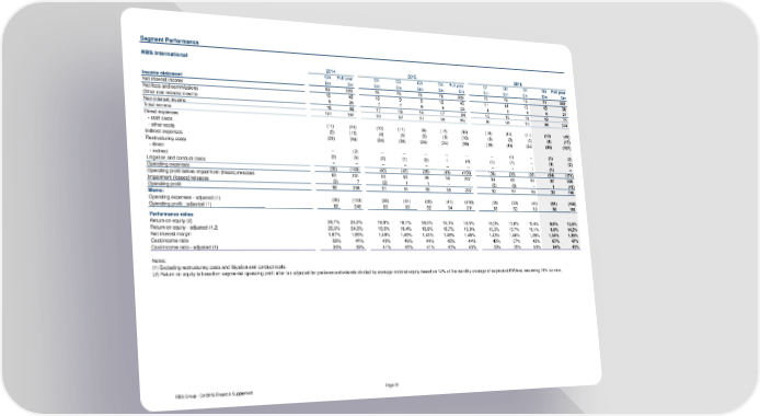Segment Performance RBS International 2014 2015 2016 Q4 Full year Q1 Q2 Q3 Q4 Full year Q1 Q2 Q3 Q4 Full year Income statement £m £m £m £m £m £m £m £m £m £m £m £m Net interest income 83 323 76 76 73 78 303 75 76 75 77 303 Net fees and commissions 13 43 10 9 9 12 40 11 14 12 13 50 Other non-interest income 5 25 7 7 5 5 24 4 5 6 6 21 Non-interest income 18 68 17 16 14 17 64 15 19 18 19 71 Total income 101 391 93 92 87 95 367 90 95 93 96 374 Direct expenses - staff costs (11) (44) (10) (11) (9) (12) (42) (10) (12) (11) (12) (45) - other costs (2) (15) (4) (4) (3) (5) (16) (5) (3) (5) (4) (17) Indirect expenses (23) (94) (24) (26) (24) (24) (98) (20) (18) (24) (45) (107) Restructuring costs - direct -- (2) -- -- -- -- -- -- (1) -- (1) (2) - indirect (2) (5) (2) (1) (2) 1 (4) (1) (1) -- (1) (3) Litigation and conduct costs -- -- -- -- -- -- -- -- -- 1 (1) -- Operating expenses (38) (160) (40) (42) (38) (40) (160) (36) (35) (39) (64) (174) Operating profit before impairment (losses)/releases 63 231 53 50 49 55 207 54 60 54 32 200 Impairment (losses)/releases (3) 7 (2) 1 1 -- -- (2) (9) -- 1 (10) Operating profit 60 238 51 51 50 55 207 52 51 54 33 190 Memo: Operating expenses - adjusted (1) (36) (153) (38) (41) (36) (41) (156) (35) (33) (40) (61) (169) Operating profit - adjusted (1) 62 245 53 52 52 54 211 53 53 53 36 195 Performance ratios Return on equity (2) 24,7% 24,2% 18,8% 18,1% 18,0% 19,1% 18,5% 16,0% 15,0% 15,4% 8,8% 13,8% Return on equity - adjusted (1,2) 25,6% 24,9% 19,5% 18,4% 18,8% 18,7% 18,9% 16,3% 15,7% 15,1% 9,8% 14,2% Net interest margin 1,67% 1,65% 1,49% 1,49% 1,43% 1,49% 1,48% 1,43% 1,40% 1,28% 1,34% 1,36% Cost:income ratio 38% 41% 43% 46% 44% 42% 44% 40% 37% 42% 67% 47% Cost:income ratio - adjusted (1) 36% 39% 41% 45% 41% 43% 43% 39% 35% 43% 64% 45% Notes: (1) Excluding restructuring costs and litigation and conduct costs. (2) Return on equity is based on segmental operating profit after tax adjusted for preference dividends divided by average notional equity based on 12% of the monthly average of segmental RWAes, assuming 10% tax rate. RBS Group - Q4 2016 Financial Supplement Page 34