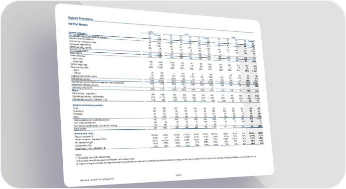 Segment Performance NatWest Markets 2014 2015 2016 Q4 Full year Q1 Q2 Q3 Q4 Full year Q1 Q2 Q3 Q4 Full year Income statement £m £m £m £m £m £m £m £m £m £m £m £m Net interest income from banking activities 8 (11) 14 16 29 28 87 19 24 32 29 104 Net fees and commissions 101 408 115 35 2 66 218 11 6 14 12 43 Income from trading activities 140 1 386 340 303 307 203 1 153 246 374 479 273 1 372 Own credit adjustments (33) (9) 46 62 78 (66) 120 64 73 (55) (29) 53 Other operating income 7 157 15 (11) (10) (45) (51) 1 -- 1 -- 2 Non-interest income 215 1 942 516 389 377 158 1 440 322 453 439 256 1 470 Total income 223 1 931 530 405 406 186 1 527 341 477 471 285 1 574 Direct expenses - staff costs (36) (446) (109) (79) (97) (63) (348) (67) (64) (61) (64) (256) - other costs (47) (190) (26) (27) (19) (50) (122) (14) (7) (7) (7) (35) Indirect expenses (293) (1 080) (257) (247) (242) (251) (997) (250) (238) (274) (267) (1 029) Restructuring costs - direct (3) (13) -- (41) (3) -- (44) -- (10) (6) (3) (19) - indirect (16) (89) (91) (179) (148) (62) (480) (12) (11) (27) (43) (93) Litigation and conduct costs (370) (832) (334) (33) (6) (5) (378) (18) (38) (6) (466) (528) Operating expenses (765) (2 650) (817) (606) (515) (431) (2 369) (361) (368) (381) (850) (1 960) Operating (loss)/profit before impairment releases/(losses) (542) (719) (287) (201) (109) (245) (842) (20) 109 90 (565) (386) Impairment releases/(losses) 6 9 8 (3) -- -- 5 -- -- -- -- -- Operating (loss)/profit (536) (710) (279) (204) (109) (245) (837) (20) 109 90 (565) (386) Memo: Total income - adjusted (1) 256 1 940 484 343 328 252 1 407 277 404 526 314 1 521 Operating expenses - adjusted (2) (376) (1 716) (392) (353) (358) (364) (1 467) (331) (309) (342) (338) (1 320) Operating (loss)/profit - adjusted (1,2) (114) 233 100 (13) (30) (112) (55) (54) 95 184 (24) 201 Analysis of income by product Rates 49 883 247 167 166 145 725 121 264 354 129 868 Currencies 162 551 90 109 96 95 390 144 122 128 157 551 Financing 57 515 134 86 31 22 273 46 56 78 66 246 Other (70) (232) (29) (55) 15 (10) (79) (34) (38) (34) (38) (144) Total excluding own credit adjustments 198 1 717 442 307 308 252 1 309 277 404 526 314 1 521 Own credit adjustments (33) (9) 46 62 78 (66) 120 64 73 (55) (29) 53 Businesses transferred to Commercial Banking 58 223 42 36 20 -- 98 -- -- -- -- -- Total income 223 1 931 530 405 406 186 1 527 341 477 471 285 1 574 Performance ratios Return on equity (3) (23,3%) (7,9%) (13,3%) (10,2%) (6,4%) (15,1%) (11,1%) (2,6%) 4,3% 3,1% (30,2%) (6,6%) Return on equity - adjusted (1,2,3) (5,9%) 1,3% 3,0% (1,9%) (2,7%) (7,6%) (2,0%) (4,4%) 3,5% 8,0% (2,7%) 1,1% Net interest margin 0,21% (0,07%) 0,40% 0,28% 0,62% 1,09% 0,53% 0,66% 0,81% 1,06% 0,82% 0,84% Cost:income ratio 343% 137% 154% 150% 127% 232% 155% 106% 77% 81% 298% 125% Cost:income ratio - adjusted (1,2) 147% 88% 81% 103% 109% 144% 104% 119% 76% 65% 108% 87% Notes: (1) Excluding own credit adjustments. (2) Excluding restructuring costs and litigation and conduct costs. (3) Return on equity is based on segmental operating profit after tax adjusted for preference dividends divided by average notional equity based on 15% of the monthly average of segmental RWAes, assuming 28% tax rate. RBS Group - Q4 2016 Financial Supplement Page 36