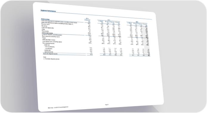 Segment Performance 2014 2015 2016 31 December 31 March 30 June 30 September 31 December 31 March 30 June 30 September 31 December Balance sheet £bn £bn £bn £bn £bn £bn £bn £bn £bn Loans and advances to customers (gross, excluding reverse repos) 26,5 31,6 22,1 19,8 16,1 18,6 21,6 19,9 17,4 Loans and advances to banks (excluding reverse repos) (1) 2,5 2,5 2,2 7,0 5,7 5,2 6,3 5,9 3,3 Reverse repos 45,9 60,1 61,7 48,8 38,6 40,4 43,1 42,7 38,6 Securities 43,7 34,3 31,0 26,0 23,7 29,5 30,1 26,4 22,0 Cash and eligible bills 10,4 10,5 15,3 13,8 14,3 12,2 10,3 6,4 13,4 Other 8,7 13,0 13,0 10,5 4,9 10,1 14,2 11,2 6,2 Total assets 276,2 308,7 256,6 250,0 215,3 255,9 284,0 249,7 240,0 Total funded assets 137,7 152,1 145,4 125,9 103,3 116,0 125,6 112,5 100,9 Customer deposits (excluding repos) 11,8 11,2 8,6 5,9 5,7 6,7 8,3 9,7 8,4 Bank deposits (excluding repos) 10,8 10,2 8,2 8,5 6,7 6,5 7,7 7,8 9,8 Repos 52,8 63,6 59,5 41,0 35,2 35,9 38,2 29,0 27,3 Debt securities in issue 4,9 4,3 4,3 3,2 3,3 3,1 2,6 2,4 5,4 Loan:deposit ratio (excluding repos) 226% 282% 257% 337% 284% 279% 260% 204% 208% Risk-weighted assets: - credit risk - non-counterparty 10,3 11,5 11,1 11,0 5,0 5,1 4,6 6,2 5,5 - counterparty 12,5 14,9 12,8 12,1 11,3 13,6 14,7 14,3 14,1 - market risk 15,4 14,5 15,0 12,8 13,8 13,4 13,4 12,1 11,6 - operational risk 3,7 2,9 2,9 2,9 3,0 4,0 4,0 4,0 4,0 Total risk-weighted assets 41,9 43,8 41,8 38,8 33,1 36,1 36,7 36,6 35,2 Note: (1) Excludes disposal groups. RBS Group - Q4 2016 Financial Supplement Page 37