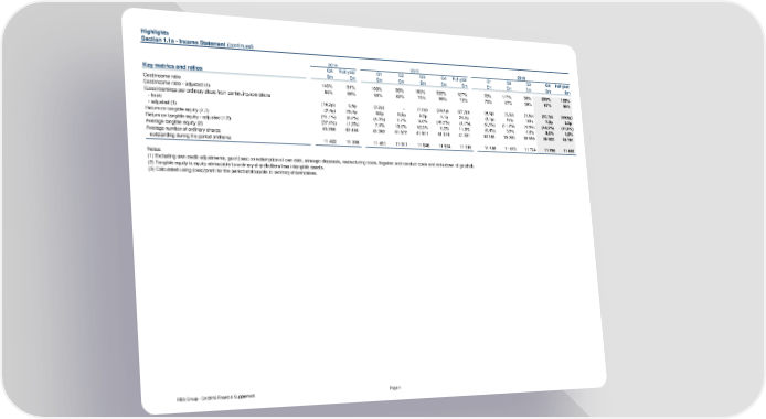 Highlights Section 1.1a - Income Statement (continued) 2014 2015 2016 Q4 Full year Q1 Q2 Q3 Q4 Full year Q1 Q2 Q3 Q4 Full year Key metrics and ratios £m £m £m £m £m £m £m £m £m £m £m £m Cost:income ratio 146% 91% 103% 99% 103% 232% 127% 79% 117% 88% 229% 129% Cost:income ratio - adjusted (1) 84% 69% 65% 62% 75% 88% 72% 76% 67% 58% 67% 66% (Loss)/earnings per ordinary share from continuing operations - basic (16,2p) 0,5p (2,2p) -- (1,0p) (24,5p) (27,7p) (8,3p) (9,3p) (3,9p) (37,7p) (59,5p) - adjusted (1) (2,4p) 25,4p 8,6p 9,9p 5,6p 5,1p 29,2p (8,1p) 2,6p 3,9p 7,0p 5,2p Return on tangible equity (2,3) (51,1%) (8,2%) (4,3%) 2,7% 9,0% (26,5%) (4,7%) (9,6%) (11,0%) (4,8%) (48,2%) (17,9%) Return on tangible equity - adjusted (1,2) (37,4%) (1,5%) 7,4% 13,5% 16,3% 6,6% 11,0% (9,4%) 3,2% 4,6% 8,6% 1,6% Average tangible equity (2) 45 268 42 464 42 392 41 572 41 911 41 319 41 821 40 383 39 283 38 696 36 855 38 791 Average number of ordinary shares outstanding during the period (millions) 11 422 11 356 11 451 11 511 11 546 11 554 11 516 11 606 11 673 11 724 11 766 11 692 Notes: (1) Excluding own credit adjustments, gain/(loss) on redemption of own debt, strategic disposals, restructuring costs, litigation and conduct costs and write down of goodwill. (2) Tangible equity is equity attributable to ordinary shareholders less intangible assets. (3) Calculated using (loss)/profit for the period attributable to ordinary shareholders. RBS Group - Q4 2016 Financial Supplement Page 4