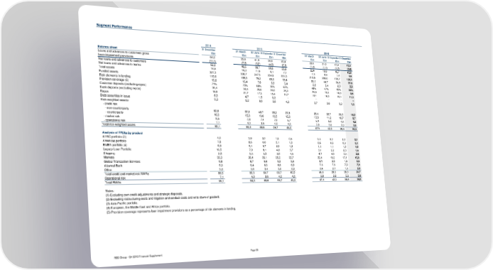 Segment Performance 2014 2015 2016 31 December 31 March 30 June 30 September 31 December 31 March 30 June 30 September 31 December Balance sheet £bn £bn £bn £bn £bn £bn £bn £bn £bn Loans and advances to customers gross 64,0 55,8 41,9 34,8 25,9 23,4 21,0 17,9 13,6 Loan impairment provisions (11,1) (7,3) (5,2) (4,0) (2,3) (1,0) (1,1) (1,2) (0,8) Net loans and advances to customers 52,9 48,5 36,7 30,8 23,6 22,4 19,9 16,7 12,8 Net loans and advances to banks 14,5 16,2 11,9 8,1 7,1 7,3 8,9 7,4 4,6 Total assets 327,3 338,7 247,5 234,9 201,5 218,8 208,0 176,7 132,5 Funded assets 115,6 108,3 79,2 66,0 53,4 50,2 44,7 34,9 27,6 Risk elements in lending 15,6 10,4 7,6 5,3 3,4 2,2 2,4 2,9 2,3 Provision coverage (5) 71% 70% 68% 76% 67% 48% 47% 40% 35% Customer deposits (excluding repos) 36,4 34,6 28,0 30,0 26,0 24,9 18,8 16,8 9,5 Bank deposits (excluding repos) 19,8 21,7 17,3 15,4 14,7 18,1 16,3 16,1 11,5 Repos 8,3 4,7 1,5 0,3 -- -- -- -- -- Debt securities in issue 9,3 8,2 6,3 5,6 4,3 3,7 3,6 3,2 1,3 Risk-weighted assets: - credit risk - non-counterparty 62,6 57,2 43,7 35,2 27,3 25,6 22,7 20,5 18,2 - counterparty 16,9 15,3 13,6 13,5 12,0 13,3 11,2 10,7 8,7 - market risk 8,5 7,8 7,4 7,0 5,7 5,9 5,6 4,6 4,8 - operational risk 7,1 4,0 3,9 4,0 4,0 2,8 2,8 2,8 2,8 Total risk-weighted assets 95,1 84,3 68,6 59,7 49,0 47,6 42,3 38,6 34,5 Analysis of RWAs by product APAC portfolio (3) 4,0 3,9 3,2 1,8 0,5 0,3 0,2 0,1 0,1 Americas portfolio 7,8 8,6 4,0 2,1 1,0 0,6 0,3 0,3 0,2 EMEA portfolio (4) 5,9 5,1 3,7 2,0 1,2 1,2 1,1 1,2 1,0 Legacy Loan Portfolio 10,5 7,9 6,1 4,8 3,7 3,1 2,2 2,0 1,4 Shipping 5,8 5,5 5,3 5,0 4,5 4,2 4,0 3,5 2,8 Markets 33,3 30,4 26,1 25,2 20,7 22,4 19,2 17,1 15,8 Global Transaction Services 9,8 8,7 6,6 5,2 3,6 3,3 2,5 1,8 0,5 Alawwal Bank 5,9 6,4 6,3 6,6 6,9 7,3 7,9 7,9 7,9 Other 5,0 3,8 3,4 3,0 2,9 2,4 2,1 1,9 2,0 Total credit and market risk RWAs 88,0 80,3 64,7 55,7 45,0 44,8 39,5 35,8 31,7 Operational risk 7,1 4,0 3,9 4,0 4,0 2,8 2,8 2,8 2,8 Total RWAs 95,1 84,3 68,6 59,7 49,0 47,6 42,3 38,6 34,5 Notes: (1) Excluding own credit adjustments and strategic disposals. (2) Excluding restructuring costs and litigation and conduct costs and write down of goodwill. (3) Asia-Pacific portfolio. (4) European, the Middle East and Africa portfolio. (5) Provision coverage represents loan impairment provisions as a percentage of risk elements in lending. RBS Group - Q4 2016 Financial Supplement Page 39