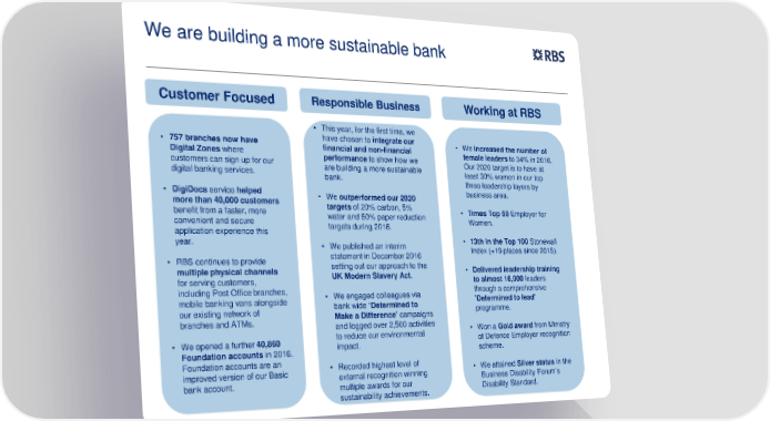 We are building a more sustainable bank Customer Focused Responsible Business Working at RBS • This year, for the first time, we have chosen to integrate our • 757 branches now have financial and non-financial • We increased the number of Digital Zones where performance to show how we female leaders to 34% in 2016. customers can sign up for our are building a more sustainable Our 2020 target is to have at digital banking services. bank. least 30% women in our top three leadership layers by • DigiDocs service helped • We outperformed our 2020 business area. more than 40,000 customers targets of 20% carbon, 5% benefit from a faster, more water and 50% paper reduction • Times Top 50 Employer for convenient and secure targets during 2016. Women. application experience this year. • We published an interim • 13th in the Top 100 Stonewall statement in December 2016 Index (+19 places since 2015). • RBS continues to provide setting out our approach to the multiple physical channels UK Modern Slavery Act. • Delivered leadership training for serving customers, to almost 16,000 leaders including Post Office branches, • We engaged colleagues via through a comprehensive mobile banking vans alongside bank wide ‘Determined to 'Determined to lead' our existing network of Make a Difference’ campaigns programme. branches and ATMs. and logged over 2,500 activities to reduce our environmental • Won a Gold award from Ministry • We opened a further 40,860 impact. of Defence Employer recognition Foundation accounts in 2016. scheme. Foundation accounts are an • Recorded highest level of improved version of our Basic external recognition winning • We attained Silver status in the bank account. multiple awards for our Business Disability Forum’s sustainability achievements. Disability Standard.