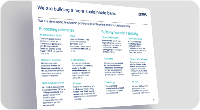We are building a more sustainable bank We are developing leadership positions on enterprise and financial capability Supporting enterprise Building financial capability Entrepreneurial Spark Boost Financial Education Opening accounts Continued supporting UK Launched Boost - a free MoneySense, our 22 year We opened a further start-up and scale up advice and expertise flagship financial education 40,860 Foundation businesses in partnership service for small programme, has helped an accounts in 2016. with Entrepreneurial businesses – regardless of estimated 4.5 million Foundation accounts are Spark by opening 6 new whether they bank with us young people understand an improved version of our hubs in 2016, bringing the or not. all about money. Basic bank account. total to 12. Women in business Leading lender Accredited Citizen’s Advice Bureau We work in partnership We have over 400 According to InfraDeals, We have been accredited with the Citizens Advice accredited Women in RBS has been the leading by the Royal National Bureau (CAB) to ensure Business specialists in lender to the UK Institute for Blind People customers in financial the UK who offer specialist renewables sector by for having an accessible difficulty are immediately expertise in supporting number of transactions mobile app for blind and transferred to an in-house women in business. over the past 5 years partially sighted customers. CAB Advisor. (2012-2016). Skills & Opportunities 40 years Technology Act Now Our Skills & Opportunities In 2016 our partnership with We are piloting We have ‘Act Now’ text Fund distributed £2.5m to the Prince’s Trust directly innovative technologies alert service to help 125 organisations, that helped over 2,000 young to help make mortgages customers manage their support people from people, with more than 120 more accessible money and avoid charges. disadvantaged supported in running their own communities start-up in business. business or get into employment. 66