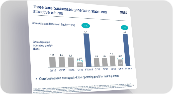 Three core businesses generating stable and attractive returns (1,2) (%) 11% 11% Core Adjusted Return on Equity 4.1 4.2 Core Adjusted operating profit(2) (£bn) 1.2 1.2 1.1 1.0 1.0 1.3 1.0(3) 0.8(3) 0.5 0.8 Q1’15 Q2’15 Q3’15 Q4’15 FY 2015 Q1’16 Q2’16 Q3’16 Q4’16 FY 2016 Core businesses averaged >£1bn operating profit for last 8 quarters (1) RBS’s CET1 target is 13% but for the purposes of computing segmental return on equity (RoE), to better reflect the differential drivers of capital usage, segmental operating profit after tax and adjusted for preference dividends is divided by notional equity allocated at different rates of 11% (Commercial Banking and Ulster Bank RoI), 12% (RBS International) and 15% for all other segments, of the monthly average of 53 (2) segmental risk-weighted assets after capital deductions (RWAes). Excluding own credit adjustments, gains/(losses) on redemption of own debt and strategic disposals. Excluding restructuring costs and litigation (3) and conduct costs and goodwill. Excluding the impact of the Bank Levy. Note: totals may not cast due to rounding.