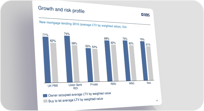 Growth and risk profile New mortgage lending 2016 (average LTV by weighted value), £bn 71% 74% 70% 70% 69% 62% 59% 62% 62% 61% 55% 54% UK PBB Ulster Bank Private RBSI W&G Total ROI Owner occupied average LTV by weighted value Buy to let average LTV by weighted value 49