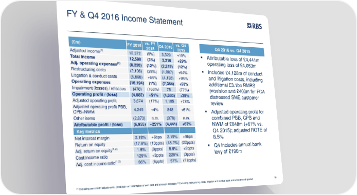 FY & Q4 2016 Income Statement (£m) FY 2016 vs. FY Q4 2016 vs. Q4 Q4 2016 vs. Q4 2015 2015 2015 (1) Adjusted income 12,372 (5%) 3,329 +15% Attributable loss of £4,441m Total income 12,590 (3%) 3,216 +29% operating loss of £4,063m (1) Adj. operating expenses (8,220) (12%) (2,219) (12%) Includes £4,128m of conduct Restructuring costs (2,106) (28%) (1,007) +64% and litigation costs, including Litigation & conduct costs (5,868) +64% (4,128) +94% Operating expenses (16,194) (1%) (7,354) +28% additional £3.1bn RMBS Impairment (losses) / releases (478) (166%) 75 (77%) provision and £400m for FCA Operating profit / (loss) (4,082) +51% (4,063) +38% distressed SME customer Adjusted operating profit 3,674 (17%) 1,185 +73% review Adjusted operating profit PBB, 4,249 +4% 848 +61% Adjusted operating profit for CPB+NWM Other items (2,873) n.m. (378) n.m. combined PBB, CPB and Attributable profit / (loss) (6,955) +251% (4,441) +62% NWM of £848m (+61% vs. Key metrics Q4 2015); adjusted ROTE of Net interest margin 2.18% +6bps 2.19% +9bps 8.5% Return on equity (17.9%) (13ppts) (48.2%) (22ppts) (1,2) Q4 includes annual bank Adj. return on equity 1.6% (9ppts) 8.6% +2ppts levy of £190m Cost:income ratio 129% +2ppts 229% (3ppts) Adj. cost:income ratio(1,2) 66% (6ppts) 67% (21ppts) (1) (2) 16 Excluding own credit adjustments, (loss)/gain on redemption of own debt and strategic disposals Excluding restructuring costs, litigation and conduct costs and write-down of goodwill
