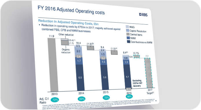 FY 2016 Adjusted Operating costs Reduction in Adjusted Operating Costs, £bn W&G Reduction in operating costs by £750m in 2017; majority achieved against Capital Resolution combined PBB, CPB and NWM businesses Central items 11.9 Other reduction NWM (1) Core business ex.NWM (0.4) (1.1) 10.4 (1.0)(2) 0.3 9.4 (1.0)(3) Organic 2.0 0.4 8.4(4) (0.75) reduction 1.5 7.7 0.4 0.2 0.8 0.4 1.7 1.5 1.3 6.0 5.9 6.1 Excluding £227m VAT recovery 2013 2014 2015 (0.1) 2017 Adj. C:I 2016 Target(5) Ratio 72% 69% 72% 66% (1) (2) (3) £0.4bn is made up of the benefit of lower intangible asset write-offs of 2013-£344m, 2014-£146m as well as the year on year benefit of FX. This includes £71m lower intangible write offs offset by £29m growth in W&G. Excluding litigation and (4) (5) conduct costs, restructuring costs, write down of goodwill and other intangible assets, 2016 VAT release and the operating costs of Williams & Glyn Numbers may not cast due to rounding The targets, expectations and trends discussed in this 43 section represent management’s current expectations and are subject to change, including as a result of the factors described in this document and in the “Risk Factors” on pages 432 to 463 of the Annual Report and Accounts 2016. These statements constitute forward looking statements, please see Forward Looking Statements on pages 64 and 65 of the company announcement.