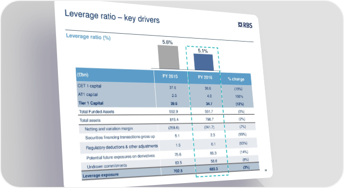 Leverage ratio – key drivers Leverage ratio (%) 5.6% 5.1% (£bn) FY 2015 FY 2016 % change CET 1 capital 37.6 30.6 (19%) AT1 capital 2.0 4.0 100% Tier 1 Capital 39.6 34.7 (12%) Total Funded Assets 552.9 551.7 (0%) Total assets 815.4 798.7 (2%) Netting and variation margin (258.6) (241.7) (7%) Securities financing transactions gross up 5.1 2.3 (55%) Regulatory deductions & other adjustments 1.5 0.1 (93%) Potential future exposures on derivatives 75.6 65.3 (14%) Undrawn commitments 63.5 58.6 (8%) Leverage exposure 702.5 683.3 (3%) 40