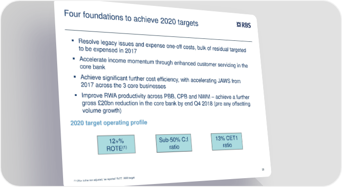 Four foundations to achieve 2020 targets Resolve legacy issues and expense one-off costs, bulk of residual targeted to be expensed in 2017 Accelerate income momentum through enhanced customer servicing in the core bank Achieve significant further cost efficiency, with accelerating JAWS from 2017 across the 3 core businesses Improve RWA productivity across PBB, CPB and NWM – achieve a further gross £20bn reduction in the core bank by end Q4 2018 (pre any offsetting volume growth) 2020 target operating profile 12+% Sub-50% C:I 13% CET1 ROTE(1) ratio ratio (1) 23 12%+ is the non adjusted, ‘as reported’ RoTE 2020 target