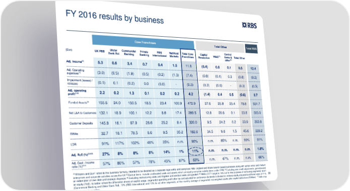 FY 2016 results by business Core Franchises Total Other Total RBS Ulster Commercial Private RBS NatWest Total Core Capital Central (£bn) UK PBB Bank RoI Banking Banking International Markets Franchises Resolution W&G(1) items & Total Other (2) other (3) Adj. Income 5.3 0.6 3.4 0.7 0.4 1.5 11.8 (0.4) 0.8 0.1 0.5 12.4 Adj. Operating (3.0) (0.5) (1.9) (0.5) (0.2) (1.3) (7.4) (0.8) (0.4) 0.3 (0.8) (8.2) expenses(4) Impairment (losses) / (0.1) 0.1 (0.2) 0.0 (0.0) - (0.2) (0.3) (0.0) - (0.3) (0.5) releases Adj. operating 2.2 0.2 1.3 0.1 0.2 0.2 4.2 (1.4) 0.4 0.5 (0.6) 3.7 (3,4) profit Funded Assets(5) 155.6 24.0 150.5 18.5 23.4 100.9 472.9 27.6 25.8 25.4 78.8 551.7 Net L&A to Customers 132.1 18.9 100.1 12.2 8.8 17.4 289.5 12.8 20.6 0.1 33.5 323.0 Customer Deposits 145.8 16.1 97.9 26.6 25.2 8.4 320.0 9.5 24.2 0.2 33.9 353.9 RWAs 32.7 18.1 78.5 8.6 9.5 35.2 182.6 34.5 9.6 1.5 45.6 228.2 LDR 91% 117% 102% 46% 35% n.m. 90% n.m. 85% n.m. 99% 91% Adj. RoE (%)(3,4,5) 27% 8% 8% 8% 14% 1% 11% n.m. n.m. n.m. n.m. 1.6% Adj. Cost : Income 57% 80% 57% 78% 45% 87% 63% n.m. 47% n.m. n.m. 66% (3,4) ratio (%) (1) ‘Williams and Glyn’ refers to the business formerly intended to be divested as a separate legal entity and comprises RBS England and Wales branch-based businesses along with certain small and medium (2) (3) enterprises and corporate activities across the UK Central items include unallocated costs and assets which principally comprise volatile items under IFRS Excluding own credit adjustments, gains/(losses) on redemption of own debt and strategic disposals (4) Excluding restructuring costs and litigation and conduct costs and goodwill (5) RBS’s CET1 target is 13% but for the purposes of computing segmental return on equity (RoE), to better reflect the differential drivers of capital usage, segmental operating profit after tax and adjusted for preference dividends is divided by notional equity allocated at different rates of 11% 33 (Commercial Banking and Ulster Bank RoI), 12% (RBS International) and 15% for all other segments, of the monthly average of segmental risk-weighted assets after capital deductions (RWAes) *Totals may not cast due to rounding