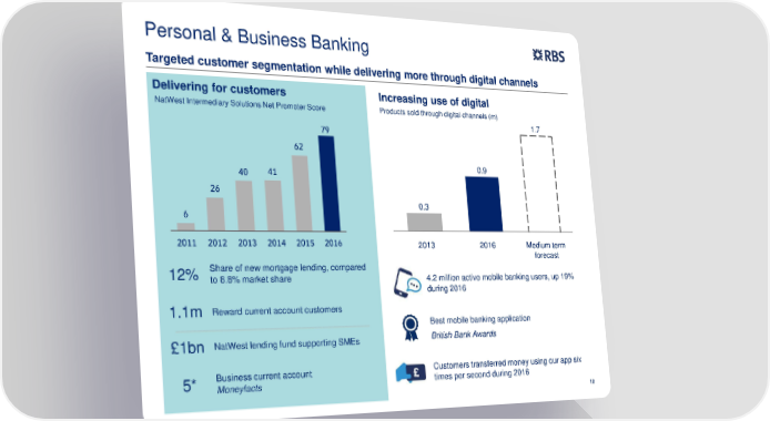 Personal & Business Banking Targeted customer segmentation while delivering more through digital channels Delivering for customers Increasing use of digital NatWest Intermediary Solutions Net Promoter Score Products sold through digital channels (m) 1.7 79 62 41 0.9 40 26 0.3 6 2011 2012 2013 2014 2015 2016 2013 2016 Medium term forecast 12% Share of new mortgage lending, compared to 8.8% market share 4.2 million active mobile banking users, up 19% during 2016 1.1m Reward current account customers Best mobile banking application £1bn NatWest lending fund supporting SMEs British Bank Awards 5* Business current account Customers transferred money using our app six Moneyfacts times per second during 2016 10
