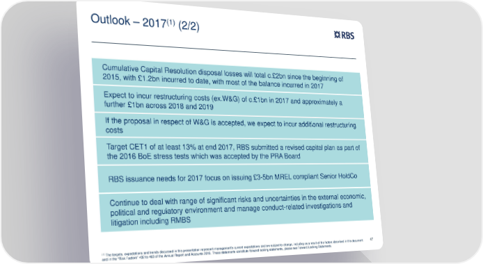 (1) Outlook – 2017 (2/2) Cumulative Capital Resolution disposal losses will total c.£2bn since the beginning of 2015, with £1.2bn incurred to date, with most of the balance incurred in 2017 Expect to incur restructuring costs (ex.W&G) of c.£1bn in 2017 and approximately a further £1bn across 2018 and 2019 If the proposal in respect of W&G is accepted, we expect to incur additional restructuring costs Target CET1 of at least 13% at end 2017, RBS submitted a revised capital plan as part of the 2016 BoE stress tests which was accepted by the PRA Board RBS issuance needs for 2017 focus on issuing £3-5bn MREL compliant Senior HoldCo Continue to deal with range of significant risks and uncertainties in the external economic, political and regulatory environment and manage conduct-related investigations and litigation including RMBS (1) The targets, expectations and trends discussed in this presentation represent management’s current expectations and are subject to change, including as a result of the factors described in this document 47 and in the “Risk Factors” 432 to 463 of the Annual Report and Accounts 2016. These statements constitute forward looking statements, please see Forward Looking Statements.