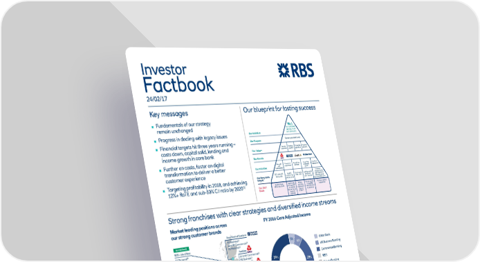 Three core franchises generating stable and attractive returns Core Adjusted Return on Equity(1,2) 11% 11% Core Adjusted 4.1 4.2 (2) Operating Profit (£bn) 1.2 1.2 1.1 1.0 1.0 1.3 1.0(3) 0.8(3) 0.5 0.8 Q1 ‘15 Q2 ‘15 Q3 ‘15 Q4 ‘15 FY 2015 Q1 ‘16 Q2 ‘16 Q3 ‘16 Q4 ‘16 FY 2016 (1) RBS’s CET1 target is 13% but for the purposes of computing segmental return on equity (RoE), to better reflect the differential drivers of capital usage, segmental operating profit after tax and adjusted for preference dividends is divided by notional equity allocated at different rates of 11% (Commercial Banking and Ulster Bank RoI), 12% (RBS International) and 15% for all other segments, of the monthly average of segmental risk-weighted assets after capital deductions (RWAes). (2) Excluding own credit adjustments, gains/(losses) on redemption of own debt and strategic disposals. Excluding restructuring costs and litigation and conduct costs and goodwill. (3) Excluding the impact of the Bank Levy, which was £190m in Q4 2016 and £230m in Q4 2015. Note: Numbers may not cast due to rounding. Improving operating JAWS and balance sheet Net Loans and Advances REILs CET1 Ratio Adjusted operating costs £bn 10% £bn +480bps £bn 232 (74%) (0.75) 211 39.4 13.4% 13.0% 9.4 (1) 8.4 7.7 120 132 8.6% UK PBB 100 Commercial 10.3 91 Banking FY 2015 FY 2016 FY 2013 FY 2016 FY 2013 FY 2016 Target FY 2015 FY 2016 2017 Target (1) Excluding £227m VAT recovery Our business profile FY 2016 Core franchises Total other Total RBS UK Ulster Commercial Private RBS NatWest Total Core Capital Central Total (£bn) (1) items & PBB Bank RoI Banking Banking International Markets Franchises Resolution W&G Other (2) other (3) 5.3 0.6 3.4 0.7 0.4 1.5 11.8 (0.4) 0.8 0.1 0.5 12.4 Adj. Income Adj. Operating expenses(4) (3.0) (0.5) (1.9) (0.5) (0.2) (1.3) (7.4) (0.8) (0.4) 0.3 (0.8) (8.2) Impairment (losses) / releases (0.1) 0.1 (0.2) 0.0 (0.0) - (0.2) (0.3) (0.0) - (0.3) (0.5) Adj. op. profit(3,4) 2.2 0.2 1.3 0.1 0.2 0.2 4.2 (1.4) 0.4 0.5 (0.6) 3.7 Funded Assets (5) 155.6 24.0 150.5 18.5 23.4 100.9 472.9 27.6 25.8 25.4 78.8 551.7 Net L&A to Customers 132.1 18.9 100.1 12.2 8.8 17.4 289.5 12.8 20.6 0.1 33.5 323.0 Customer Deposits 145.8 16.1 97.9 26.6 25.2 8.4 320.0 9.5 24.2 0.2 33.9 353.9 RWAs 32.7 18.1 78.5 8.6 9.5 35.2 182.6 34.5 9.6 1.5 45.6 228.2 Loan:Deposit Ratio 91% 117% 102% 46% 35% n.m. 90% 135% 85% n.m. 99% 91% Adj. RoE (%)(3,4, 5) 27% 8% 8% 8% 14% 1% 11% n.m. n.m. n.m. n.m. 1.6% Adj. Cost:Income ratio (%)(3,4) 57% 80% 57% 78% 45% 87% 63% n.m. 47% n.m. n.m. 66% (1)‘Williams and Glyn’ refers to the business formerly intended to be divested as a separate legal entity and comprises RBS England and Wales branch-based businesses along with certain small and medium enterprises and corporate activities across the UK (2) Central items include unallocated costs and assets which principally comprise volatile items under IFRS (3) Excluding own credit adjustments, gains/(losses) on redemption of own debt and strategic disposals (4) Excluding restructuring costs and litigation and conduct costs and goodwill (5) RBS’s CET1 target is 13% but for the purposes of computing segmental return on equity (RoE), to better reflect the differential drivers of capital usage, segmental operating profit after tax and adjusted for preference dividends is divided by notional equity allocated at different rates of 11% (Commercial Banking and Ulster Bank RoI), 12% (RBS International) and 15% for all other segments, of the monthly average of segmental risk-weighted assets after capital deductions (RWAes) *Totals may not cast due to rounding. RBS reported an attributable loss of £7bn for 2016, see the 24th February Company Announcement for the full results 2