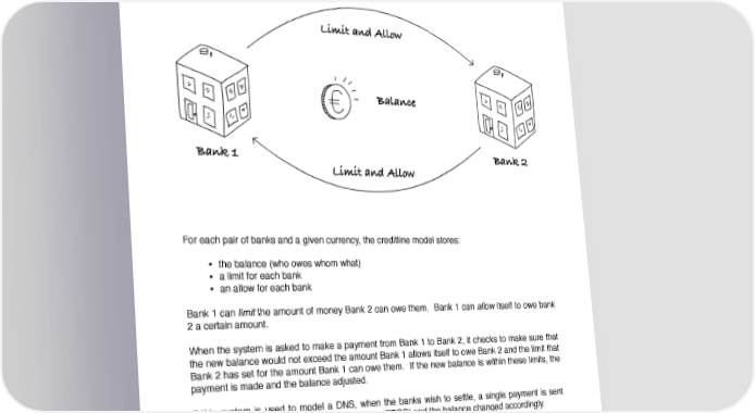 Emerald The underlying model takes a risk-based approach, tracking balances and limits. It is called the creditline model. Creditline Model For each pair of banks and a given currency, the creditline model stores: • the balance (who owes whom what) • a limit for each bank • an allow for each bank Bank 1 can limit the amount of money Bank 2 can owe them. Bank 1 can allow itself to owe bank 2 a certain amount. When the system is asked to make a payment from Bank 1 to Bank 2, it checks to make sure that the new balance would not exceed the amount Bank 1 allows itself to owe Bank 2 and the limit that Bank 2 has set for the amount Bank 1 can owe them. If the new balance is within these limits, the payment is made and the balance adjusted. If this system is used to model a DNS, when the banks wish to settle, a single payment is sent using the Real Time Gross Settlement System (RTGS) and the balance changed accordingly. 3