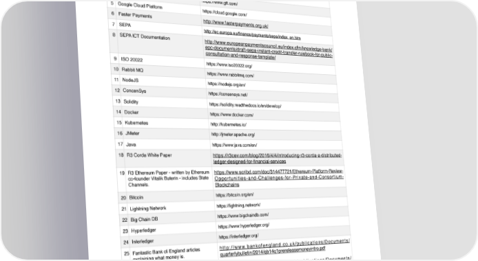 References Note Reference 1 Ripple cost savings https://ripple.com/insights/ripple-and-xrp-can-cut-banks-global-settlement- costs-up-to-60-percent/ 2 Royal Bank of Scotland http://www.rbs.com/ 3 Ethereum https://www.ethereum.org/ 4 GFT https://www.gft.com/ 5 Google Cloud Platform https://cloud.google.com/ 6 Faster Payments http://www.fasterpayments.org.uk/ 7 SEPA http://ec.europa.eu/finance/payments/sepa/index_en.htm 8 SEPA ICT Documentation http://www.europeanpaymentscouncil.eu/index.cfm/knowledge-bank/ epc-documents/draft-sepa-instant-credit-transfer-rulebook-for-public- consultation-and-response-template/ 9 ISO 20022 https://www.iso20022.org/ 10 Rabbit MQ https://www.rabbitmq.com/ 11 NodeJS https://nodejs.org/en/ 12 ConcenSys https://consensys.net/ 13 Solidity https://solidity.readthedocs.io/en/develop/ 14 Docker https://www.docker.com/ 15 Kubernetes http://kubernetes.io/ 16 JMeter http://jmeter.apache.org/ 17 Java https://www.java.com/en/ 18 R3 Corda White Paper https://r3cev.com/blog/2016/4/4/introducing-r3-corda-a-distributed- ledger-designed-for-financial-services 19 R3 Ethereum Paper - written by Ethereum https://www.scribd.com/doc/314477721/Ethereum-Platform-Review- co-founder Vitalik Buterin - includes State Opportunities-and-Challenges-for-Private-and-Consortium- Channels. Blockchains 20 Bitcoin https://bitcoin.org/en/ 21 Lightning Network https://lightning.network/ 22 Big Chain DB https://www.bigchaindb.com/ 23 Hyperledger https://www.hyperledger.org/ 24 Interledger https://interledger.org/ 25 Fantastic Bank of England articles http://www.bankofengland.co.uk/publications/Documents/ explaining what money is. quarterlybulletin/2014/qb14q1prereleasemoneyintro.pdf http://www.bankofengland.co.uk/publications/Documents/ quarterlybulletin/2014/qb14q1prereleasemoneycreation.pdf 26 GFT Testing Methodology http://www.gft.com/blockchain 27 Emerald GitLab Repository https://gitlab.com/emerald-platform/emerald 28 Emerald website http://emerald-dl.com/ 10